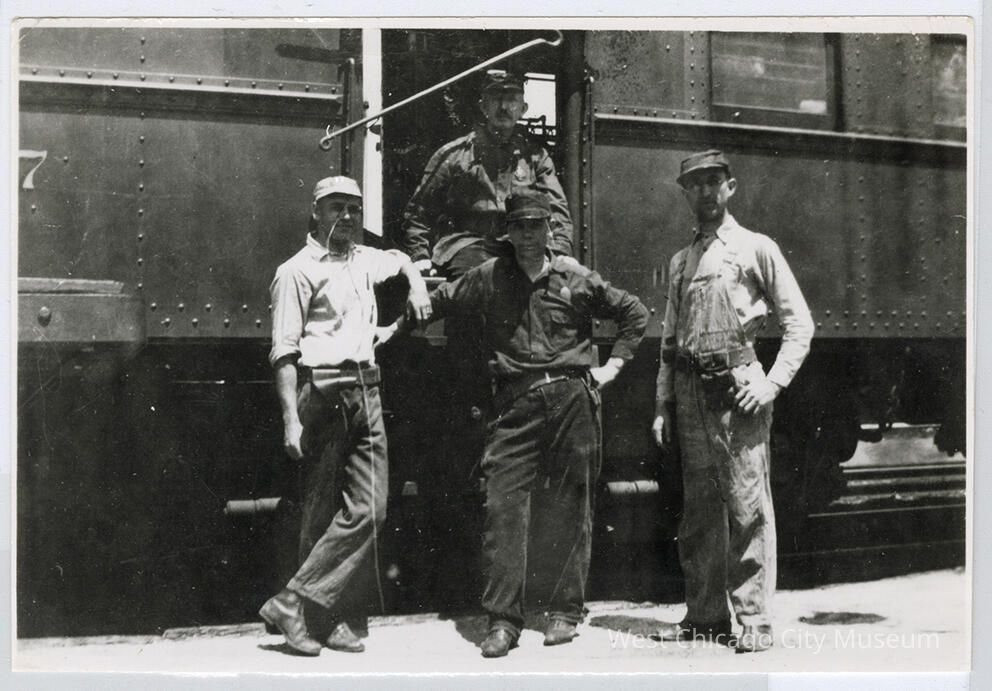 Photograph, black and white, showing 4 men in baggy working clothes posed at the door of a railroad car (presumably a mail car.) Walter E. Larson is possibly standing on the left or center. C. 1920 6.25 x 4.25 "