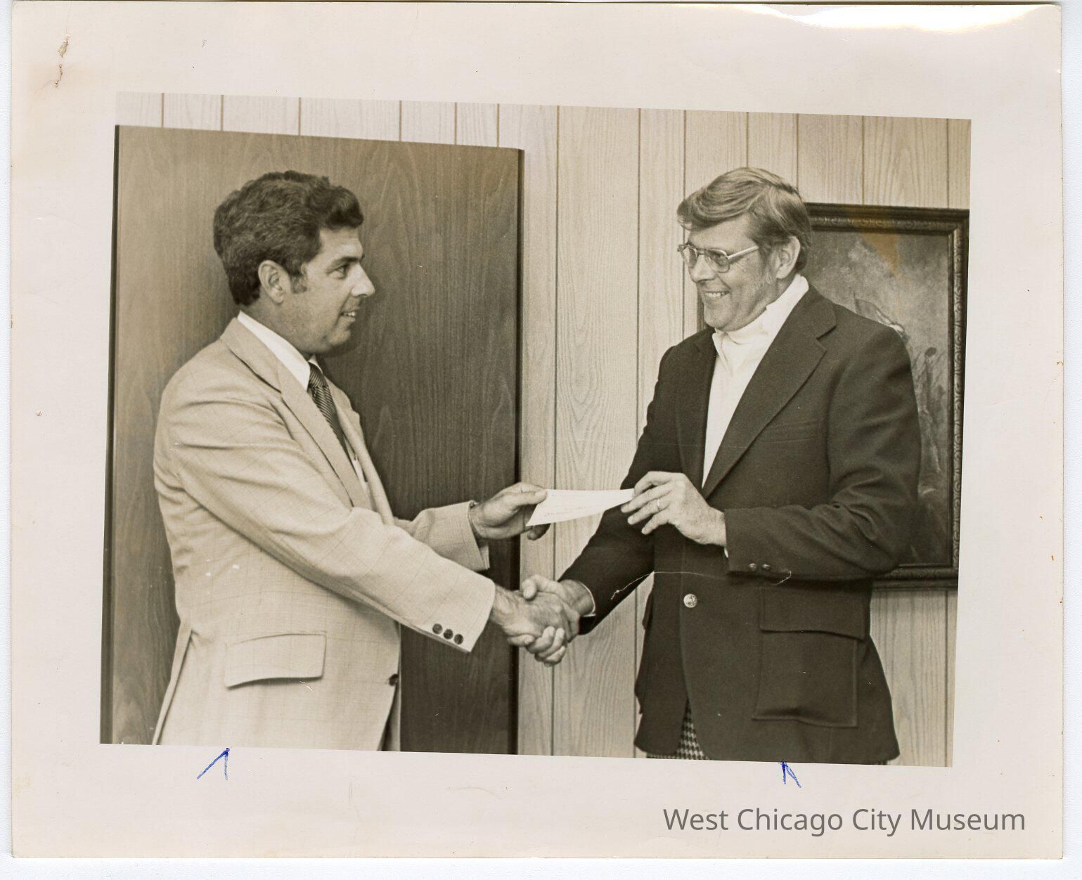 Photograph, 8 x 10 black and white, landscape orientation, showing Park District commissioner Paul Woodward (short dark hair, light colored jacket, tie) shaking the hand and receiving a check from Bob Westrom (on right, glasses, with dark coat, white shirt, no tie). Back has stamp from Beacon-News, and in pen reads "2x3 64% 2nd area FRI" Photo by Beth Ewing.Photograph Details
