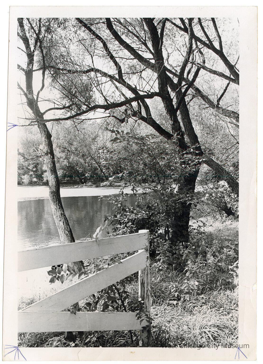 Photograph, 8 x 10 black and white, portrait orientation, showing the Easton Park Pond. The pond is artfully obscured with a white wooden fence and trees on its bank. Back has stamp from Beacon-News, and in pen reads "88% 2nd-Area CT New Park - 3x5 1/2 (right pic) Wednesday" With Wednesday underlined twice. Photo by Paul Jacobson.