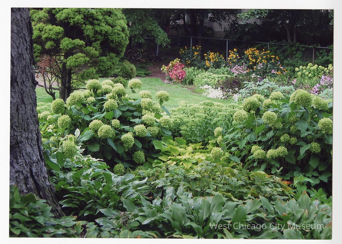 Photograph, color, showing the Kruse Museum Garden in the summer. There is a tree on the right side of the photograph edge, and forefront has a bed of hostas with green hydrangeas behind them. Along the chain-link fence are flowering plants in pinks and yellows. 7x5 inches, landscape orientation
