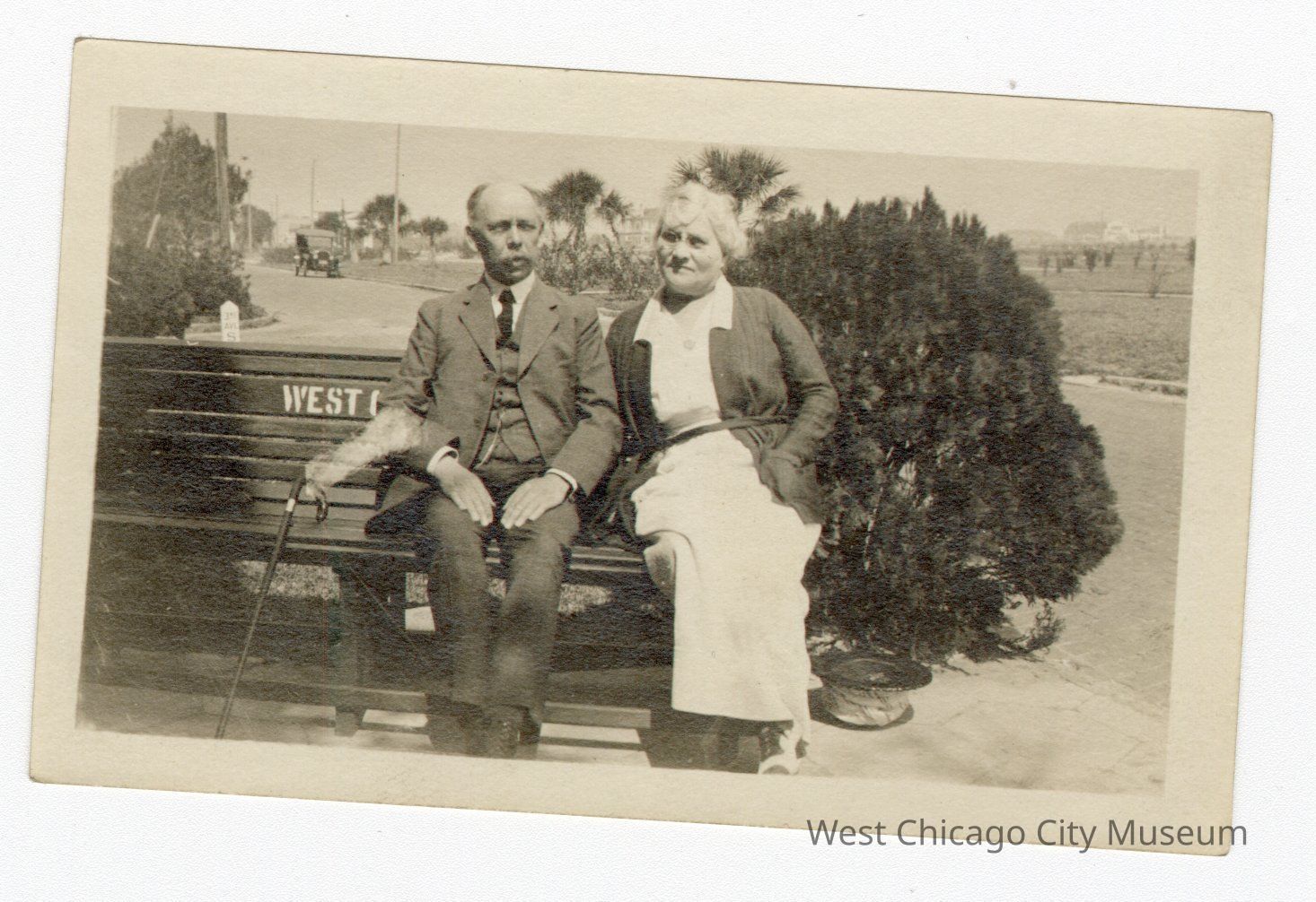 Black and white photograph of man and woman sitting on bench. Man is in three piece suit with tie and cane resting on bench beside him on left. Woman on right leaning towards him with hands resting on side of thighs. White outfit with dark belt and dark cardigan. “West” on bench to left of man. Bush behind woman almost as tall as she is sitting. Car in background on road in top left corner. On back “Tye” and “56.”Collection
