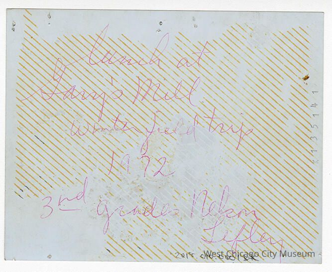 Indian Knoll School photos, black and white, rectangle - shows students seated at forward facing desks. There is a female teacher standing, looking to the right of the photo with a smile, with two students standing in front of her. Back reads "lunch as Gary's Mill winter field trop 1972 3rd grades Nelson Tefley (Lefley?)"