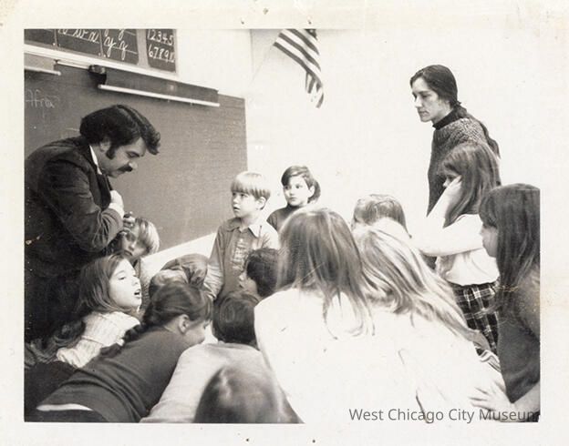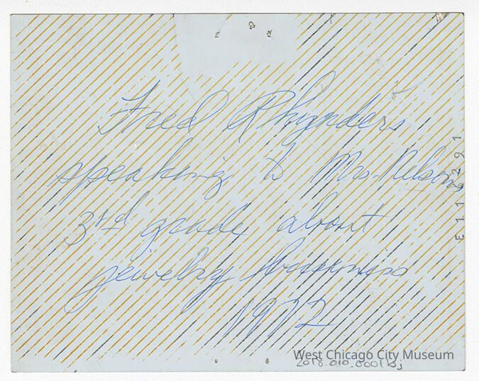 Indian Knoll School photos, black and white, rectangle - shows students leaning forward to get a closer look at something on the table. There is a woman on the right and a mustachioed man also leaning over the table. Back reads "Fred Rhynders speaking to Mrs. Nelson's 3rd grade about jewelry business 1972"
