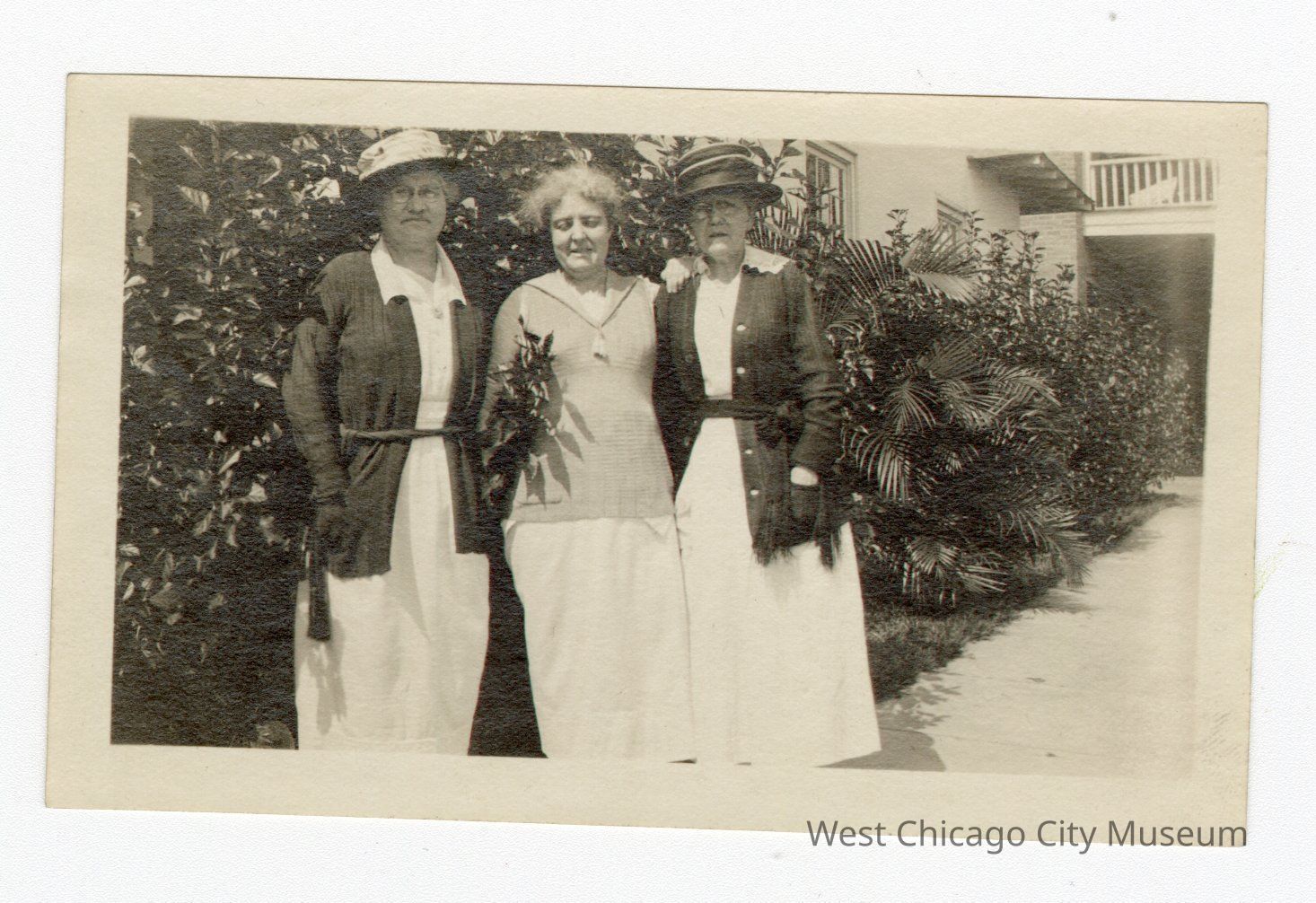 Black and white photograph with white border. Three women standing in front of buses with building behind bushes. One balcony in top right corner and sidewalk in bottom right corner. Women on sides in similar outfits with dark coats, belts, white dresses, wearing gloves and hats (woman on right has darker hat than woman on left). Woman in middle in lighter clothes, eyes closed, white skirt. “5-6” on back.Collection