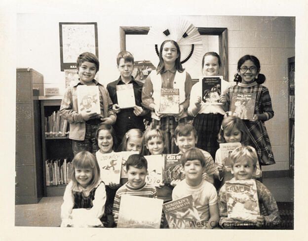 Indian Knoll School photos, black and white, rectangle - shows 3 rows of students, each holding a book in front of them. 14 students total. Back reads "1972 Library book donations"