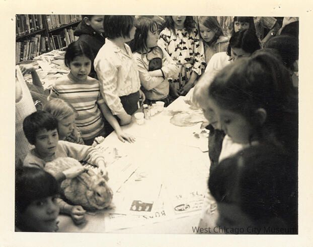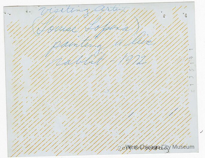 Indian Knoll School photos, black and white, rectangle - shows students standing around a table. There is a fat bunny on the lower left photo, on the table, around an artist painting the bunny. Back reads "Visiting artist (Louise Lopina) painting a live rabbit - 1972"