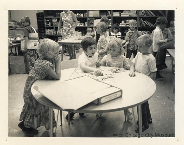 Indian Knoll School photos, black and white, rectangle - Shows children mingling; there are 4 children seated in the front of the photo at a round table, playing a game with a spinner and board that reads "Snail _____" Back reads "Learning Center 1971"