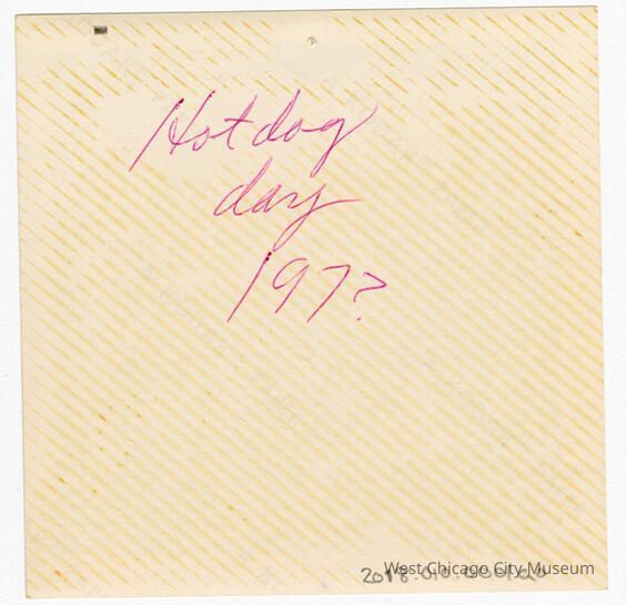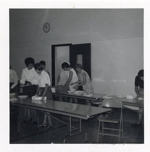 Indian Knoll School photos, black and white, square - Shows women behind rectangle tables either setting up or cleaning up plates, etc. Back reads "Hotdog day 197?"