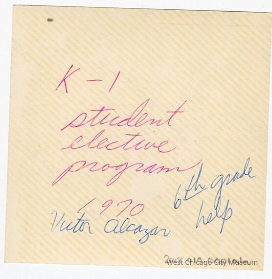 Indian Knoll School photos, black and white, square - shows an older boy with a checkered shirt and striped pants leaning over to give a small ball to students against the left wall. He is standing in front of bowling pins (oblong capsule shape). Back reads "K-1 student elective program 1970 Victor Alcazar 6th grade help"
