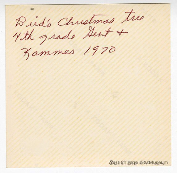 Indian Knoll School photos, black and white, square - shows a group of children in coats, decorating a tree with popcorn garland. Back reads "Bird's [sic] Christmas tree 4th grade Gent & Kammes 1970"