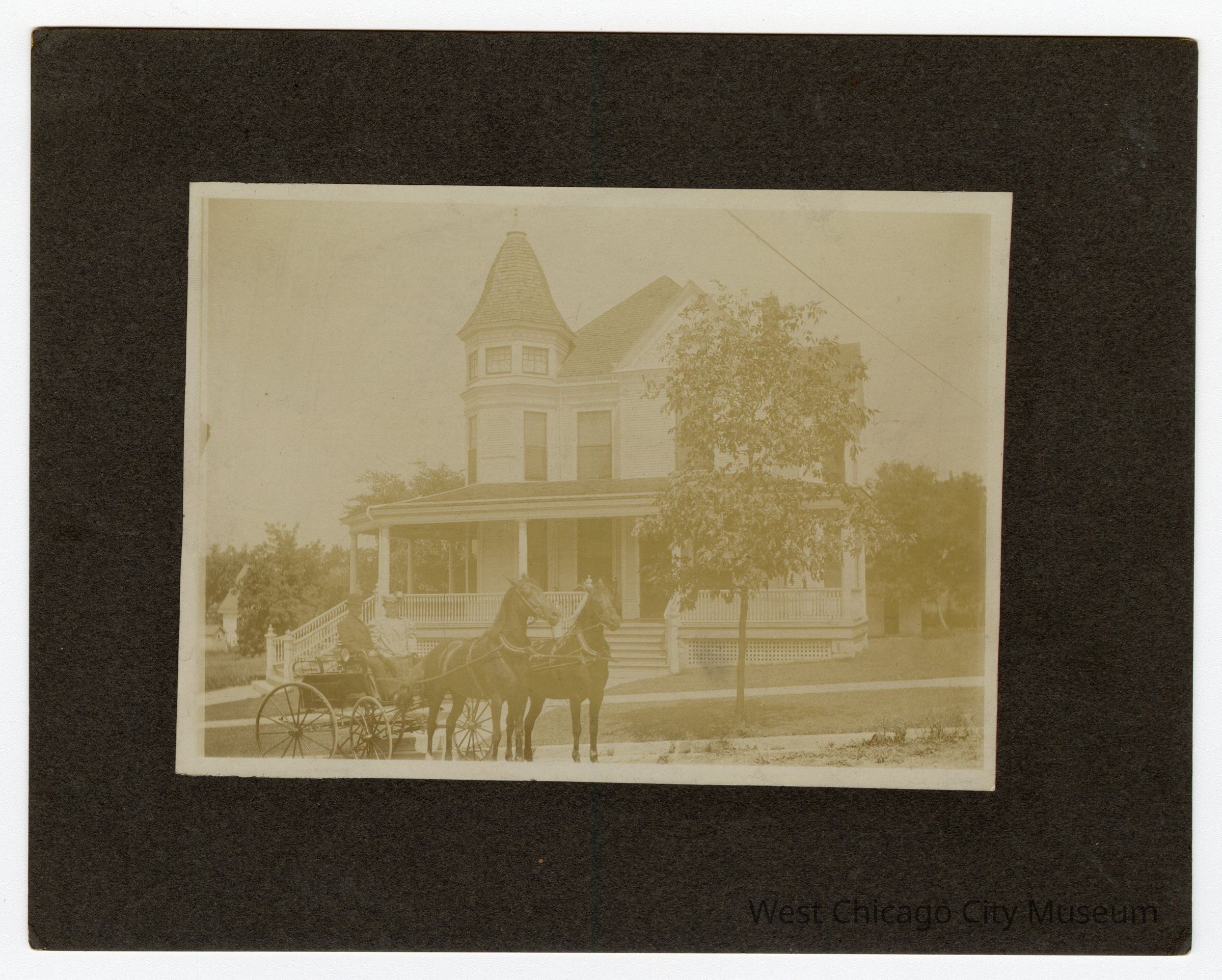 Sepia photograph with white border on black matting. House in background with wrap around porch. Tree in front slightly to right. Horse and buggy in front bottom left corner on road with two horses and man and woman sitting in it.Collection