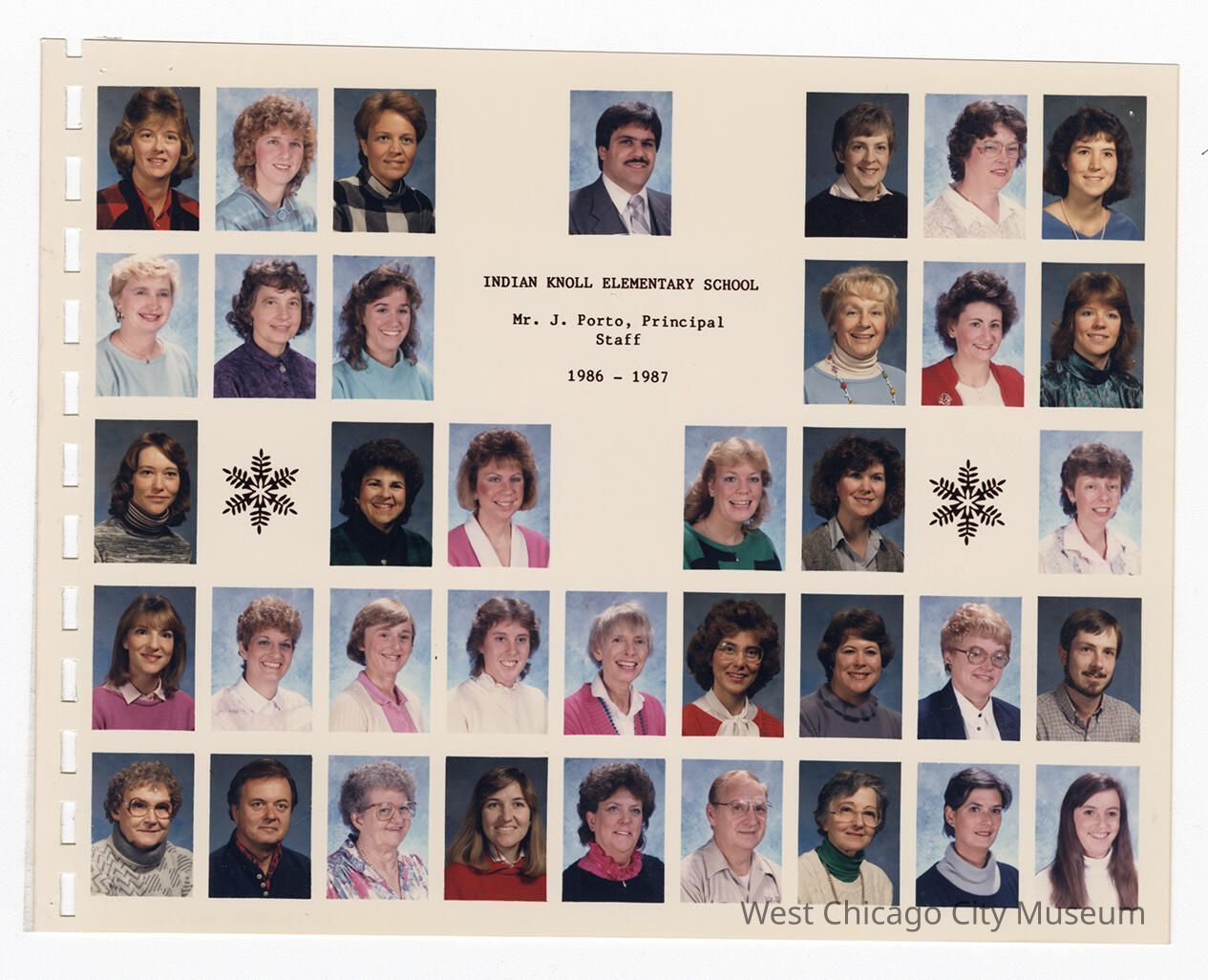 Class photo collage, color, reads "Indian Knoll Elementary School Mr. Porto, Principal, STAFF 1987-1988". 3 individual photos laid out in 5 rows. Left side of the photo has perforations for a comb binding. From left to Right:
