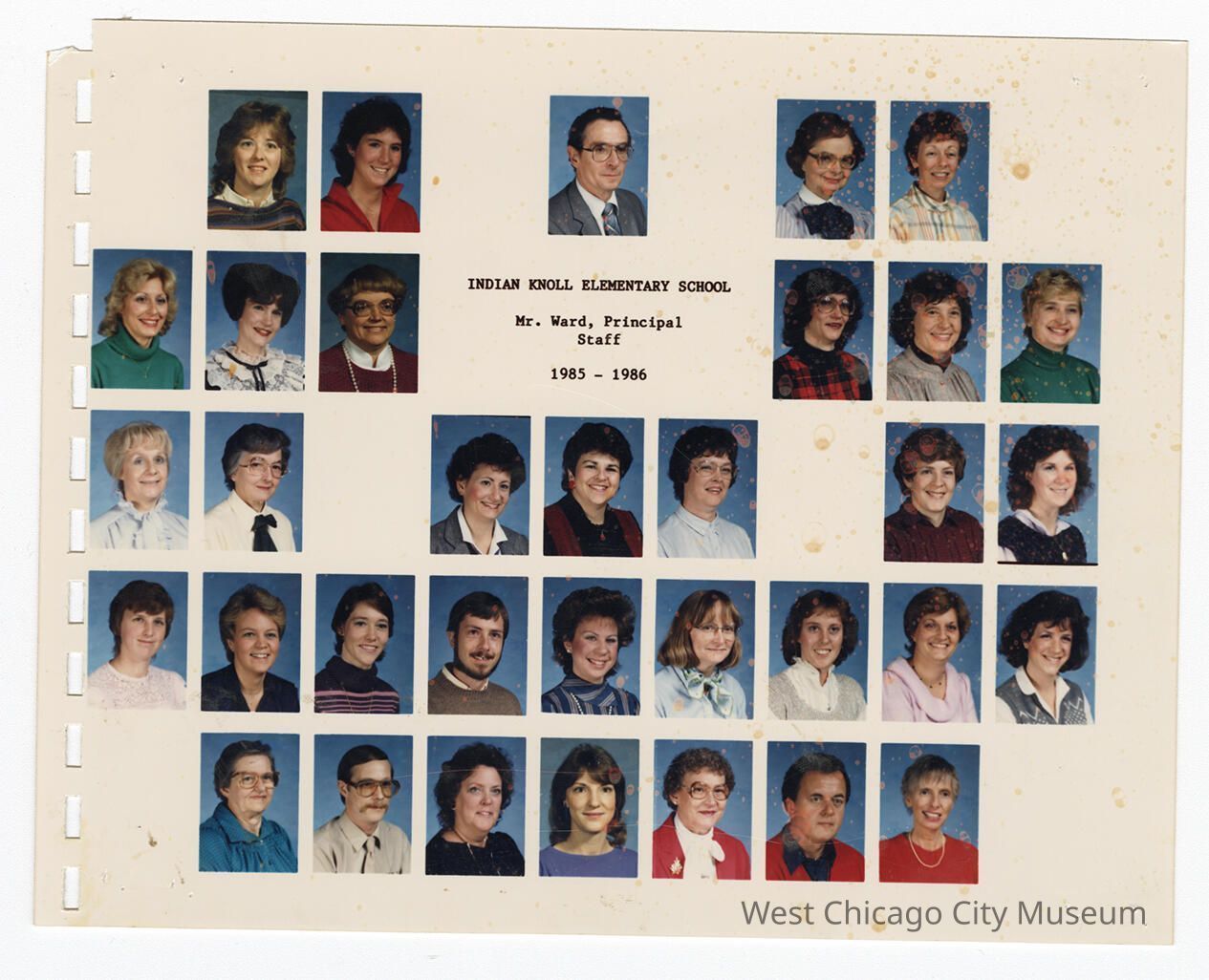 Class photo collage, color, reads "Indian Knoll School, B. Ward, Principal, Staff 1985 -1986". 34 individual photos laid out in 5 rows. Left side of the photo has perforations for a comb binding.