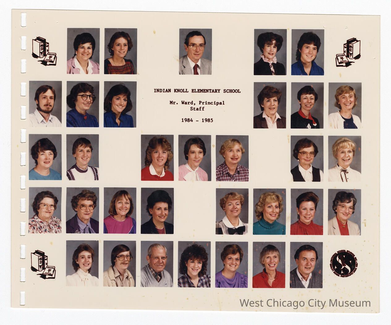 Class photo collage, color, reads "Indian Knoll School, B. Ward, Principal, Staff 1984 -1985". 33 individual photos laid out in 5 rows. Left side of the photo has perforations for a comb binding.