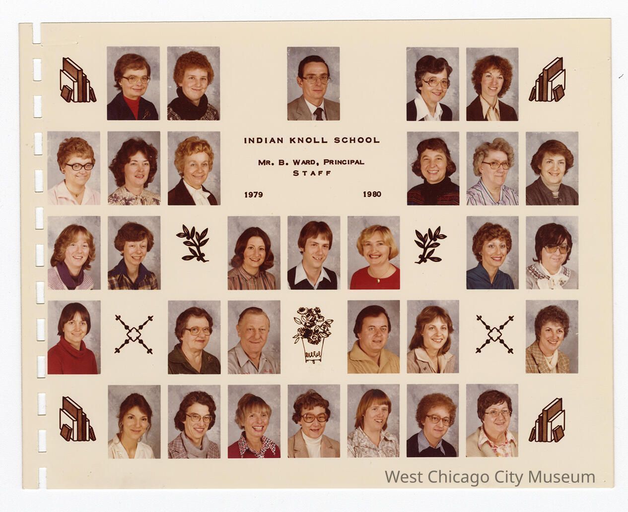 Class photo collage, color, reads "Indian Knoll School, B. Ward, Principal, STAFF 1979 1980". 31 individual photos laid out in 5 rows. Left side of the photo has perforations for a comb binding.