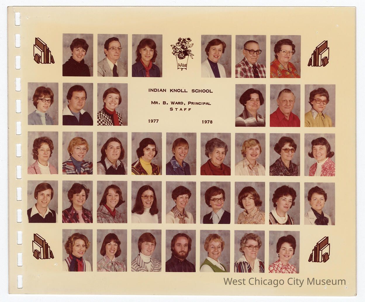 Class photo collage, color, reads "Indian Knoll School, B. Ward, Principal, STAFF 1977 1978". 39 individual photos laid out in 5 rows. Left side of the photo has perforations for a comb binding.