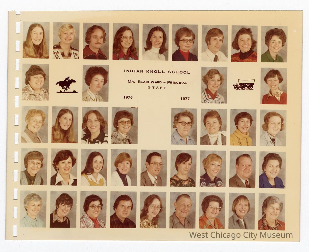 Class photo collage, color, reads "Indian Knoll School, B. Ward, Principal, STAFF 1976 Bicentennial 1977". 39 individual photos laid out in 5 rows; Blair Ward is center on the 4th row. Left side of the photo has perforations for a comb binding.