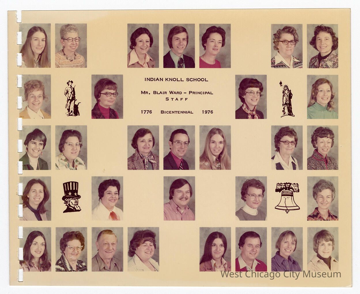 Class photo collage, color, reads "Indian Knoll School, B. Ward, Principal, STAFF 1776 Bicentennial 1976". 31 individual photos laid out in 5 rows; Blair Ward is center on the middle row. Left side of the photo has perforations for a comb binding.
