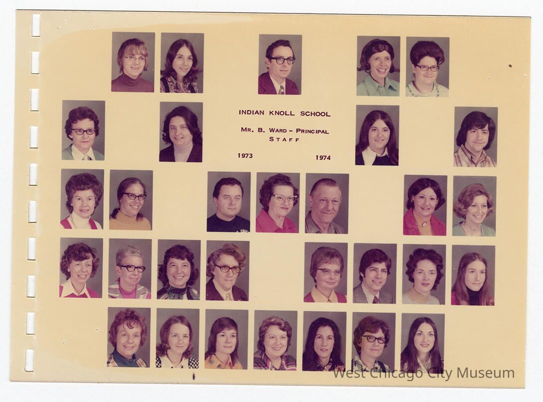 Class photo collage, color, reads "Indian Knoll School B. Ward, Principal, STAFF 1973-1974". 31 individual photos laid out in 5 rows; Blair Ward is center on the top row. Left side of the photo has perforations for a comb binding.