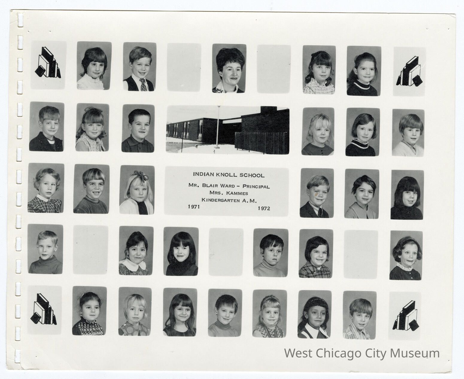 Class photo collage, "Indian Knoll School Mr. Blair Ward, Principal, Mrs. Kammes Kindergarten A.M. 1971-1972". 30 individual photos; Mrs. Diane Kammes is center on the top row. Center 2nd row has a double wide image of the school. Left side of the photo has perforations for a comb binding.