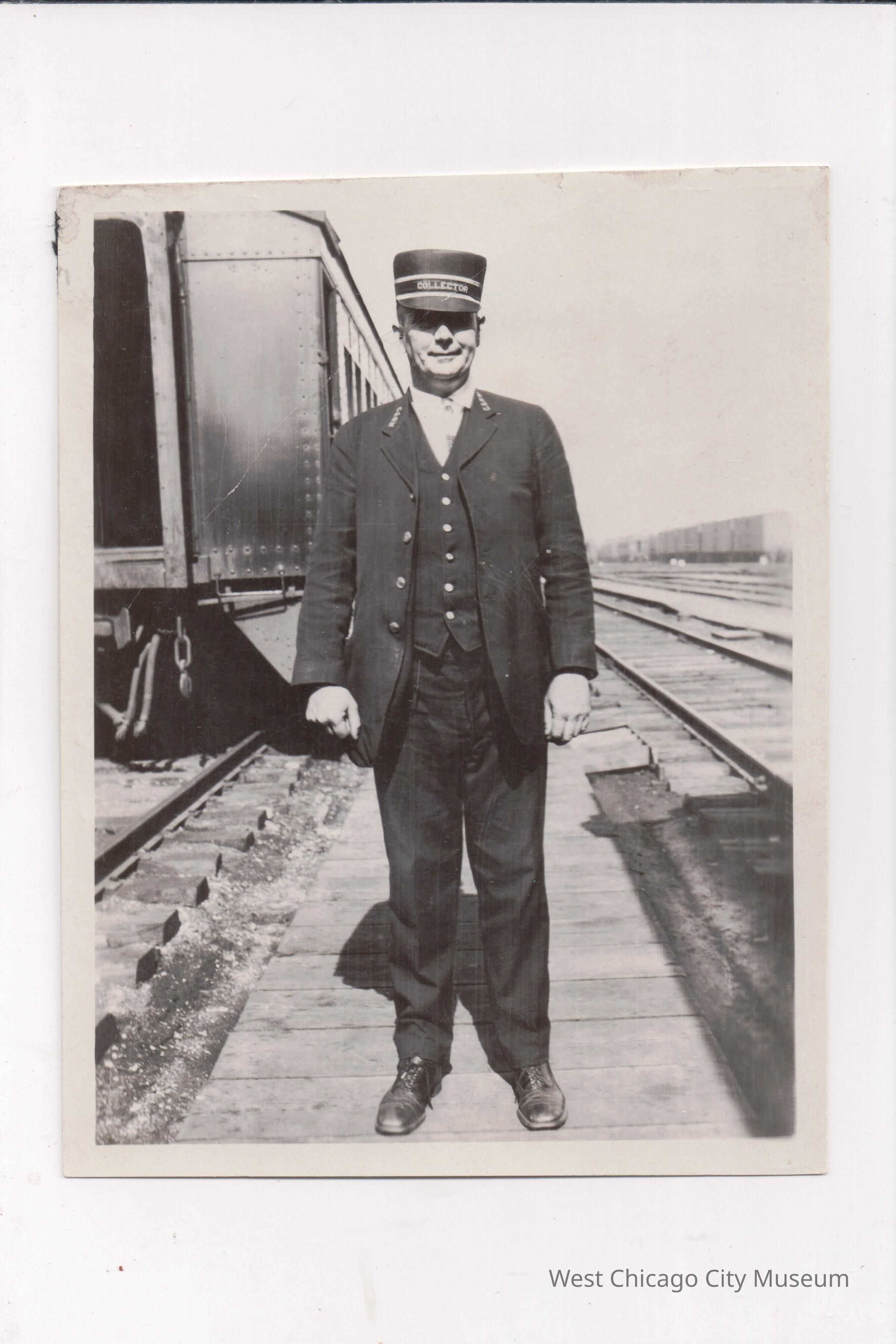 Photograph of unidentified railroad collector / conductor (Fred Ehredt). He is wearing a conductors uniform and is standing outside next to a train on the tracks in a railroad yard. More tracks and another train are behind him, right side of the photo.