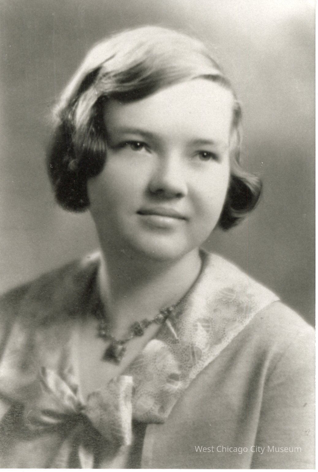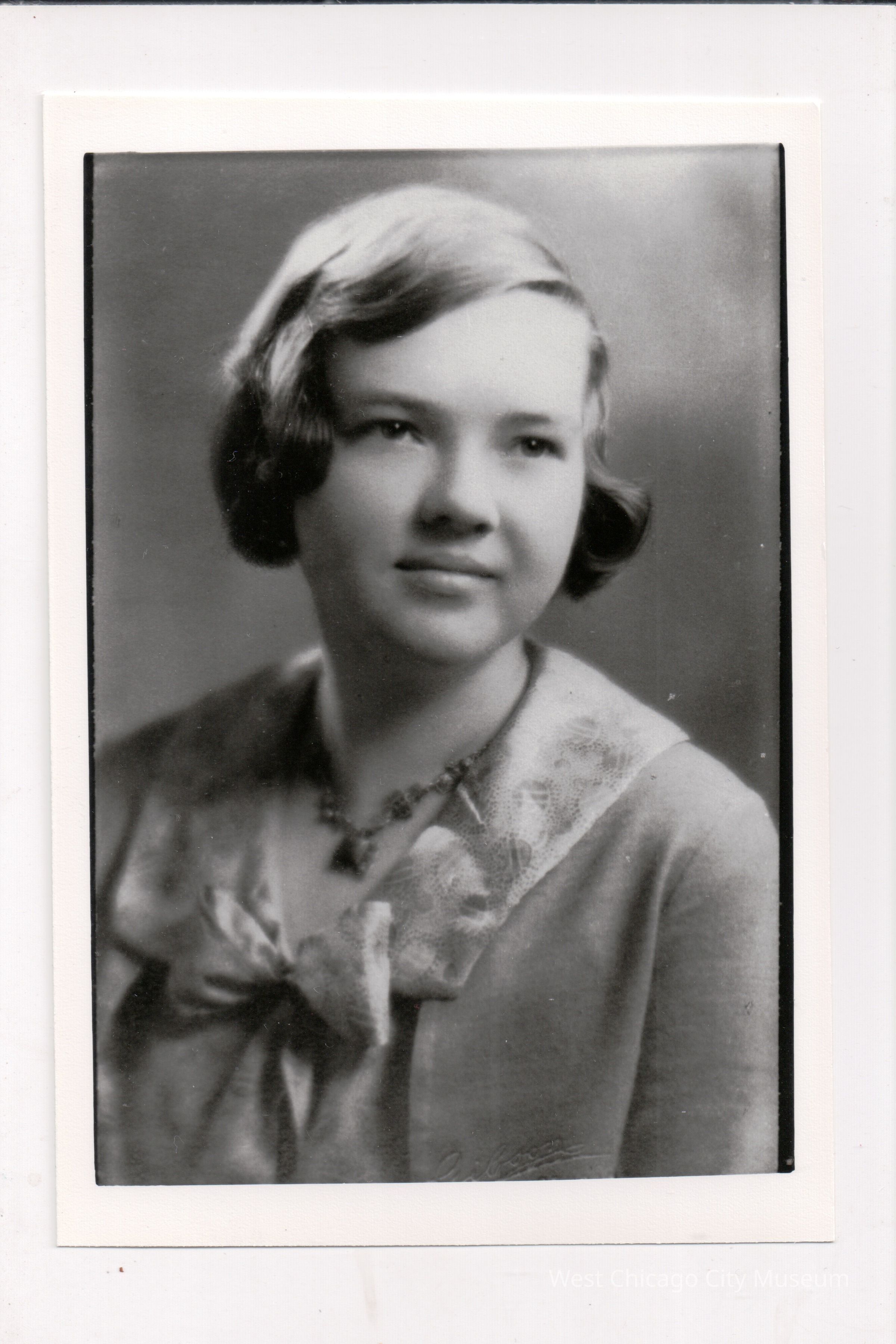 Copy of photograph, Norma Fairbank. Shows a young woman, studio portrait. Her hair is bobbed with a wave, and she is wearing a dress with a bow on the front collar. Copy is 3.5 x 5.1"