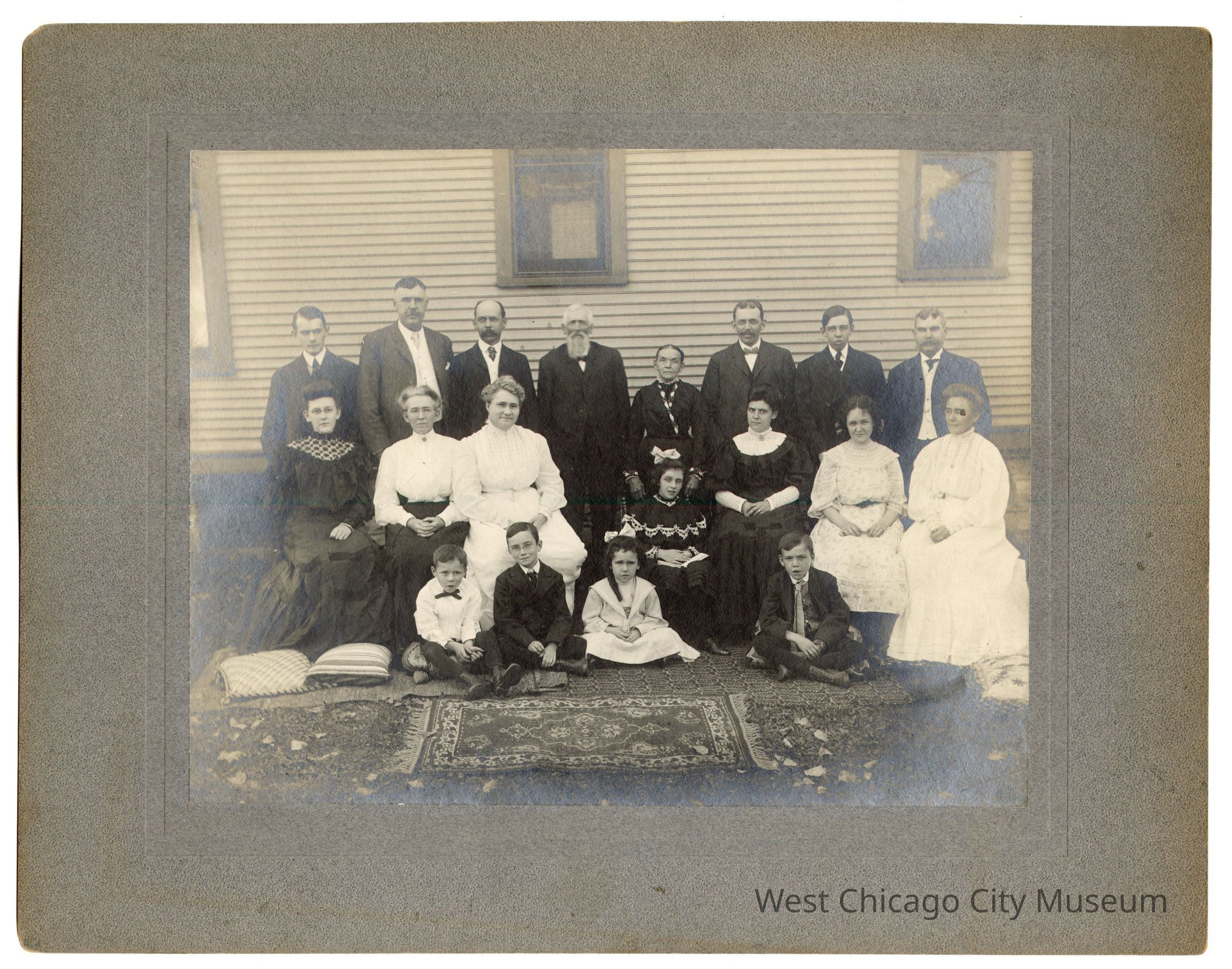 Black and white photograph with grey matting. Group of people sitting and standing before side of house with carpets and pillows on the grass. Leaves on grass. 7 men standing in back row with one woman also standing. Middle row is 7 women sitting. Front row is 4 children sitting on pillows. There are two empty pillows on the left and one on that right that nobody is sitting on. Front row l to r: boy in white shirt with what looks like skinny bowtie with both legs stretched out in front of him. Boy next to him is wearing glasses, suit and tie, legs crossed. Girl to right is in white dress with white bow in hair, legs crossed and hands in lap. There is a gap between her and boy on right. Boy on right is wearing suit and tie (suit not buttoned like it is for the other boy), his mouth is open. Middle row l to r: Woman in dark dress with light pattern by neckline, wearing glasses, her left hand is resting in her lap. Woman next to her is in white blouse long sleeve top with broach at neck, hands clasped in lap, wearing glasses, dark skirt. Next woman is in all white, hands clasped in lap, wearing glasses. Girl sitting with hands on book in lap, white bow in hair, dark dress with white lace around shoulders and chest and end of sleeves. Woman to right of her is sitting with her hands clasped in her lap. Dark dress with white around neck and chest and white sleeves from elbows to wrist. Next soman is in all white with hands in lap holding something. Her forearms are not covered. Woman on far right in all white hands clasped in lap has glasses. Back row from l to r: man with buttoned suit and tie. Man with suite and tie suit not buttoned, mustache. Man with suit and tie and mustache. These three have dark hair. Third man is bald top of his head. Next man in buttoned suit and bowtie has grey hair and beard down to top of bowtie. Woman wearing glasses, shortest in back row. Man in buttoned suit and bowtie, wearing glasses, has mustache. Dark hair. Man in buttoned suit and tie, dark hair. Man with unbuttoned suit and bowtie, has mustache.Collection