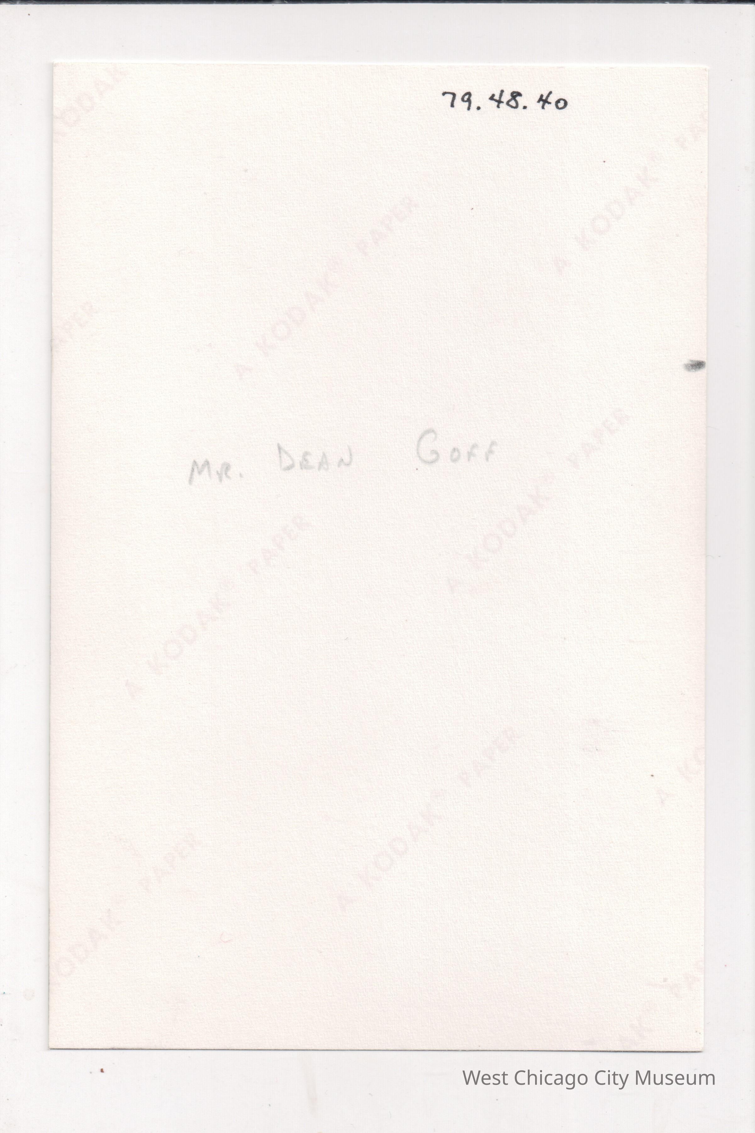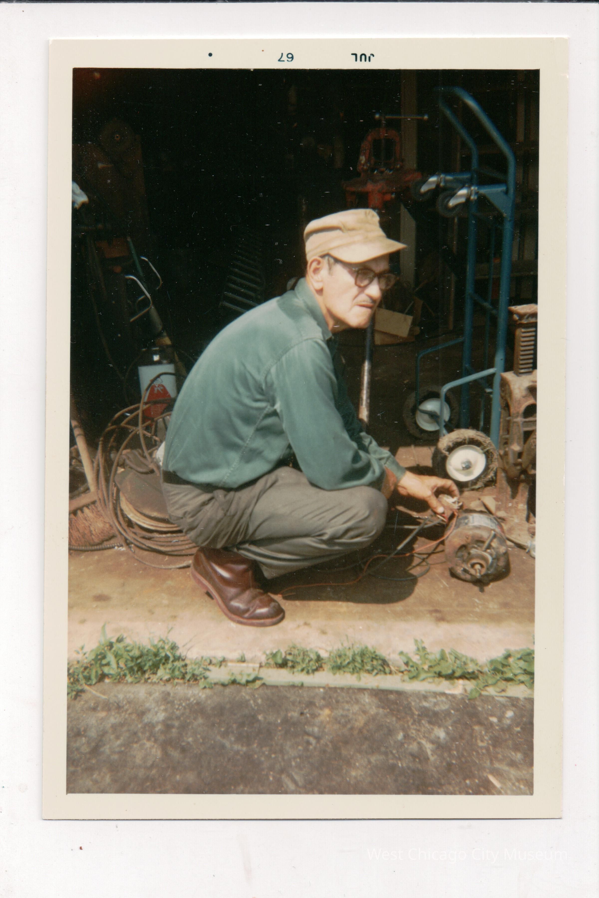 Photograph, color, showing Dean Goff crouched down in front of an open garage. There are various pieces of equipment and dollies behind him. On the ground in front of him is a motor, rusty. He is wearing a green long sleeved shirt and khaki pants and a sand colored cap. Edge of photo has date "July 67"