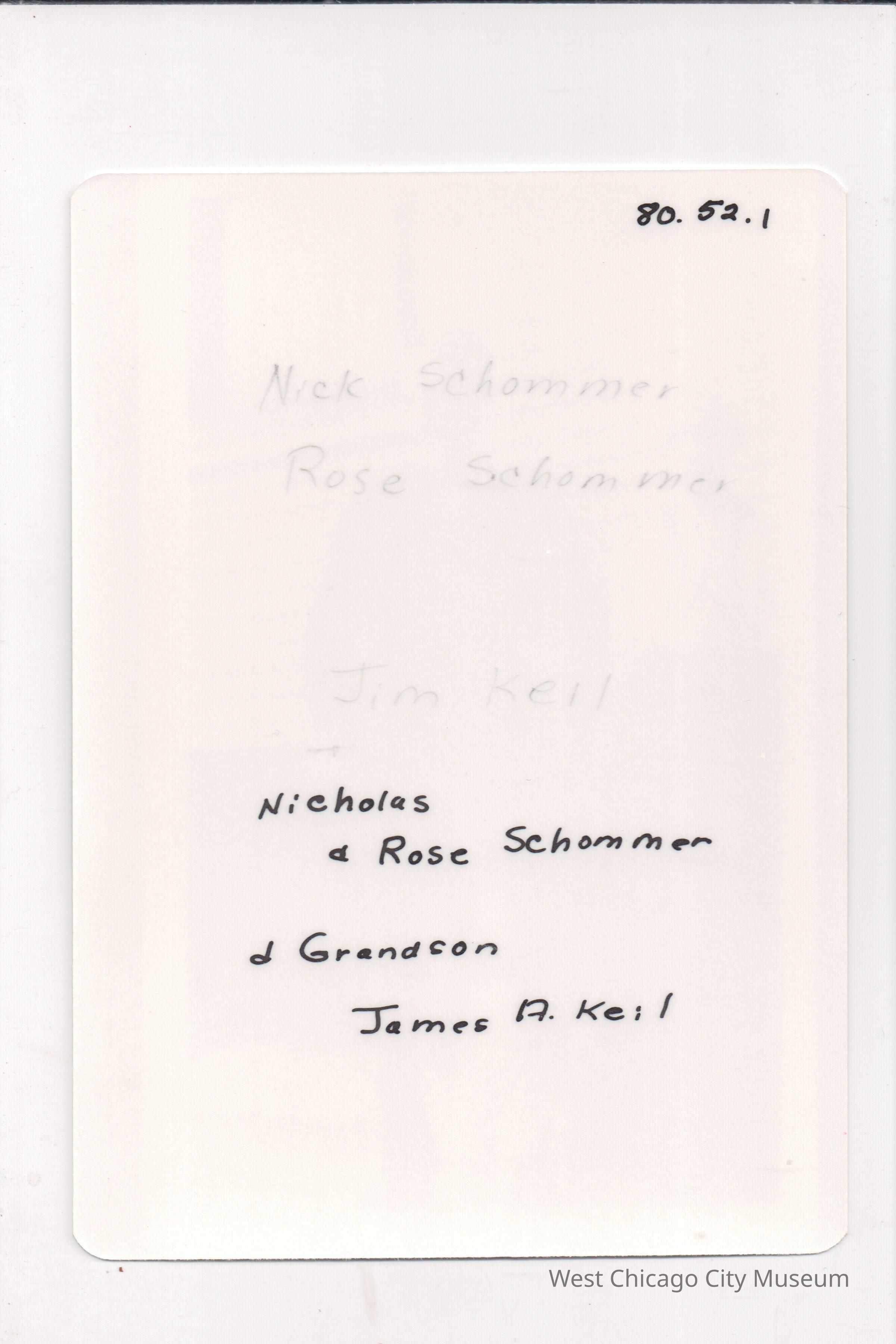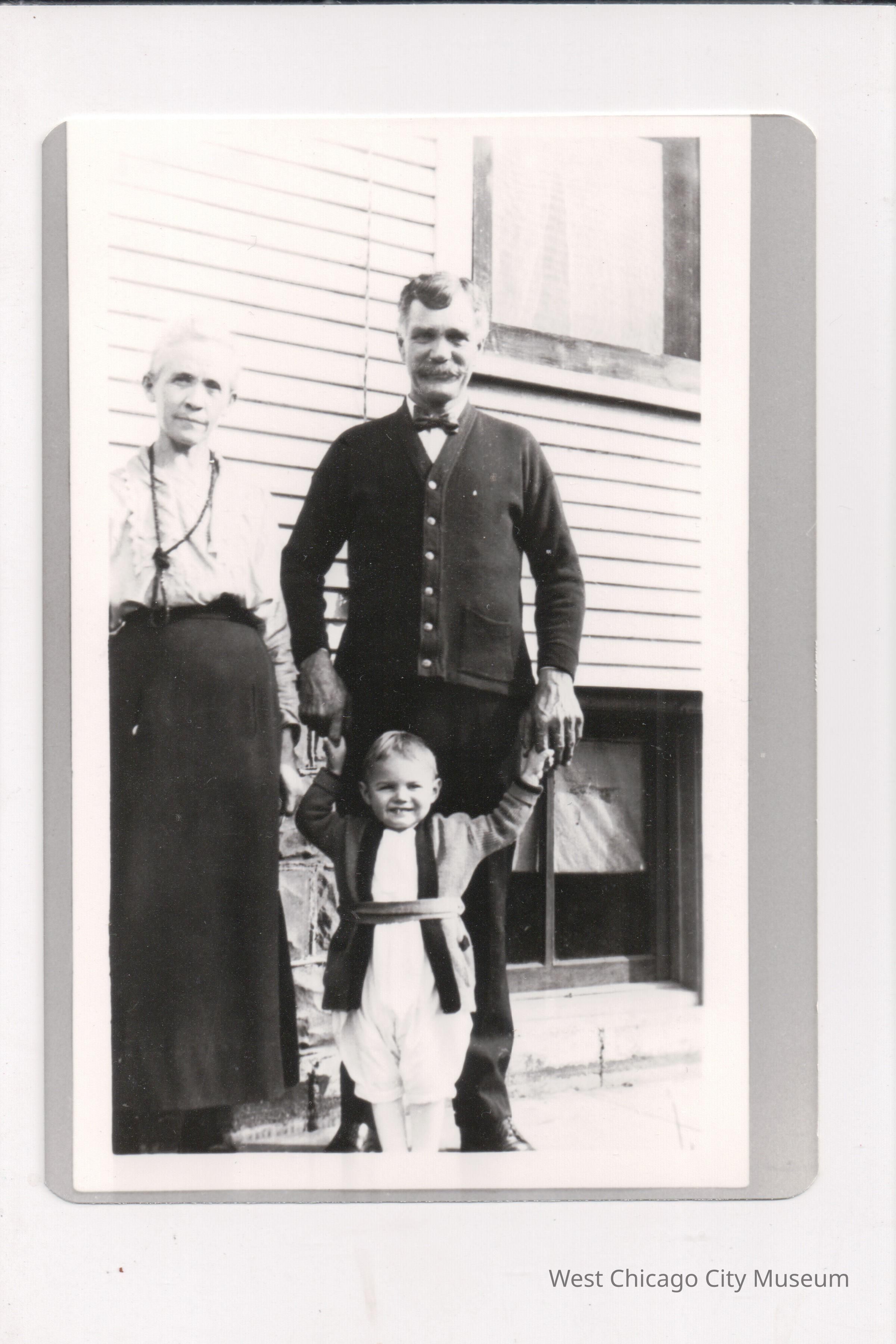 Photograph of Nicholas & Rose Schommer with grandson James A. Keil (about 1925 or 1926). The photo is a copy - a snapshot of the original photograph. Shows an older couple with a standing with a smiling toddler. The woman has grey hair, a white blouse, dark dress and long, lariat style necklace, askew and knotted. The man is wearing a 6 button sweater, with a bowtie. The boy is in cuffed short pants (or jodpurs) and looks like he has a short open jacket on with a thick band around the waist. They are standing in front of a side of a building with siding and a window, likely a home.Photograph Details