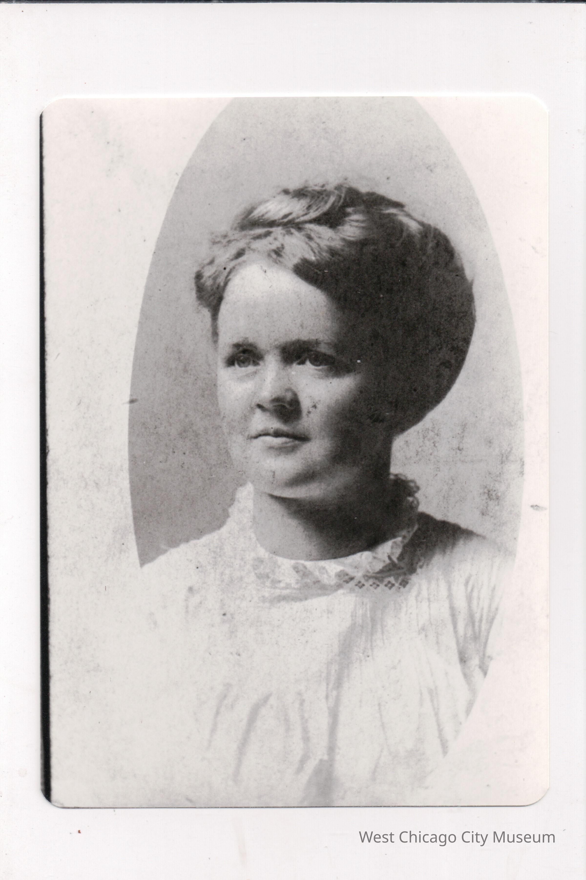 Photograph, black and white of Adella Anderson as a young woman. She is wearing a high necked white blouse and has she hair gently pulled up on her head. She is posed, looking to the left of the camera. The photo is a copy of a taller image - Adella is in a oval shaped vignette that is cut off at the top and bottom.