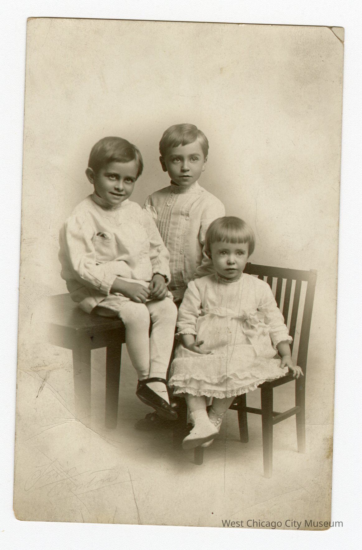 Post Card: Photograph of three children (portrait orientation). Girl sitting on chair in dress with ankles crossed on right, positioned the lowest of the three. Boy sitting on table on the left with hands in lap and ankles crossed. Third child, boy, standing behind the other two in the middle and tallest. All three are looking off to the right. All three have short hair. On back top left: “Post Card” and below it on left “Correspondence Here” and on right “Name and Address Here” (both are written in all caps). Top right “Place Stamp Here” with “AAZOA” around “Place Stamp Here” repeating across all four sides.Collection