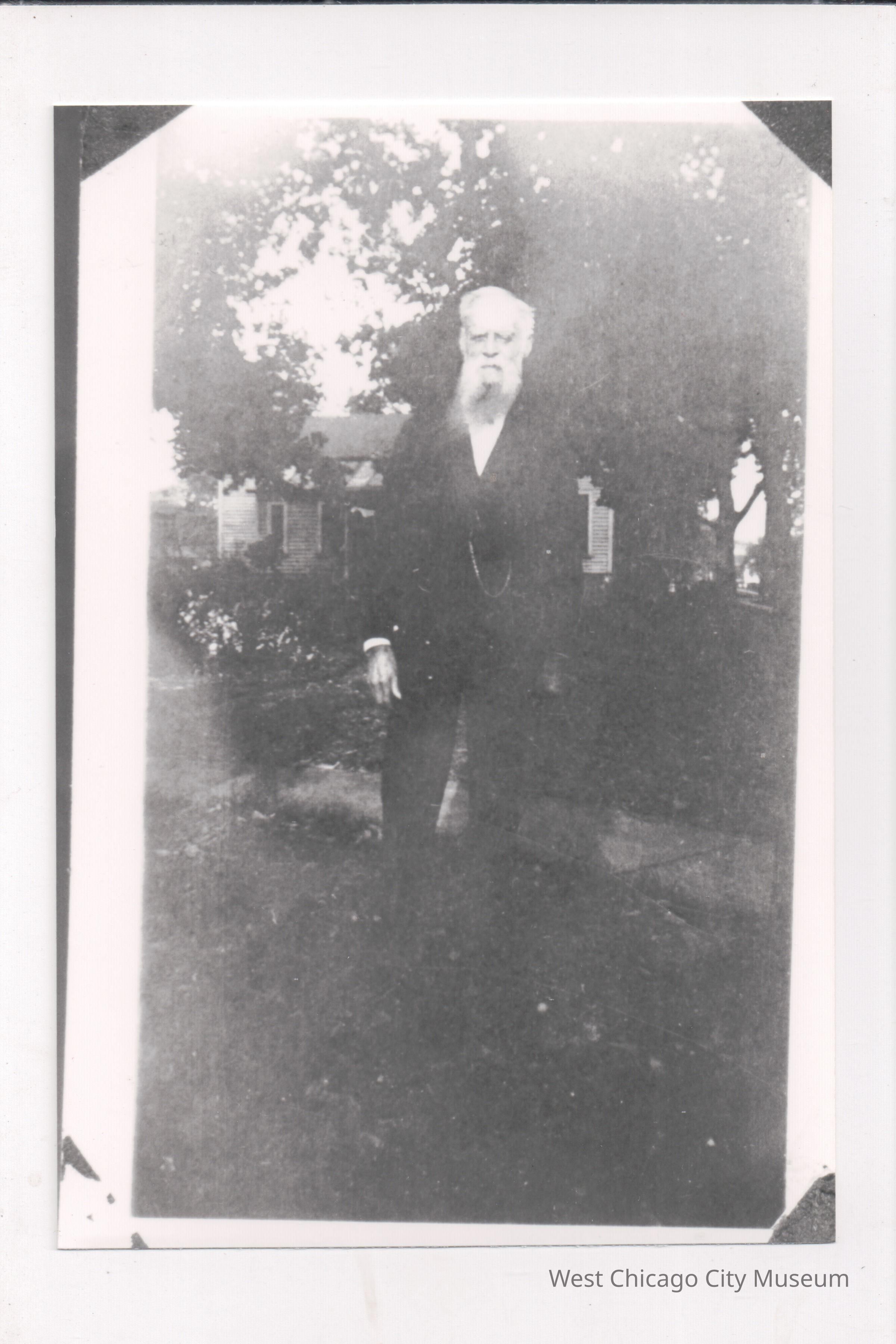Photograph, black and white, showing Henry S. Wood, c. 1925. He is a tall, slender man with short white hair and a long grey beard. He is waering a black suit with a watch chain showing. The photo is taken outdoors; behind him appears to be a small building or chapel.