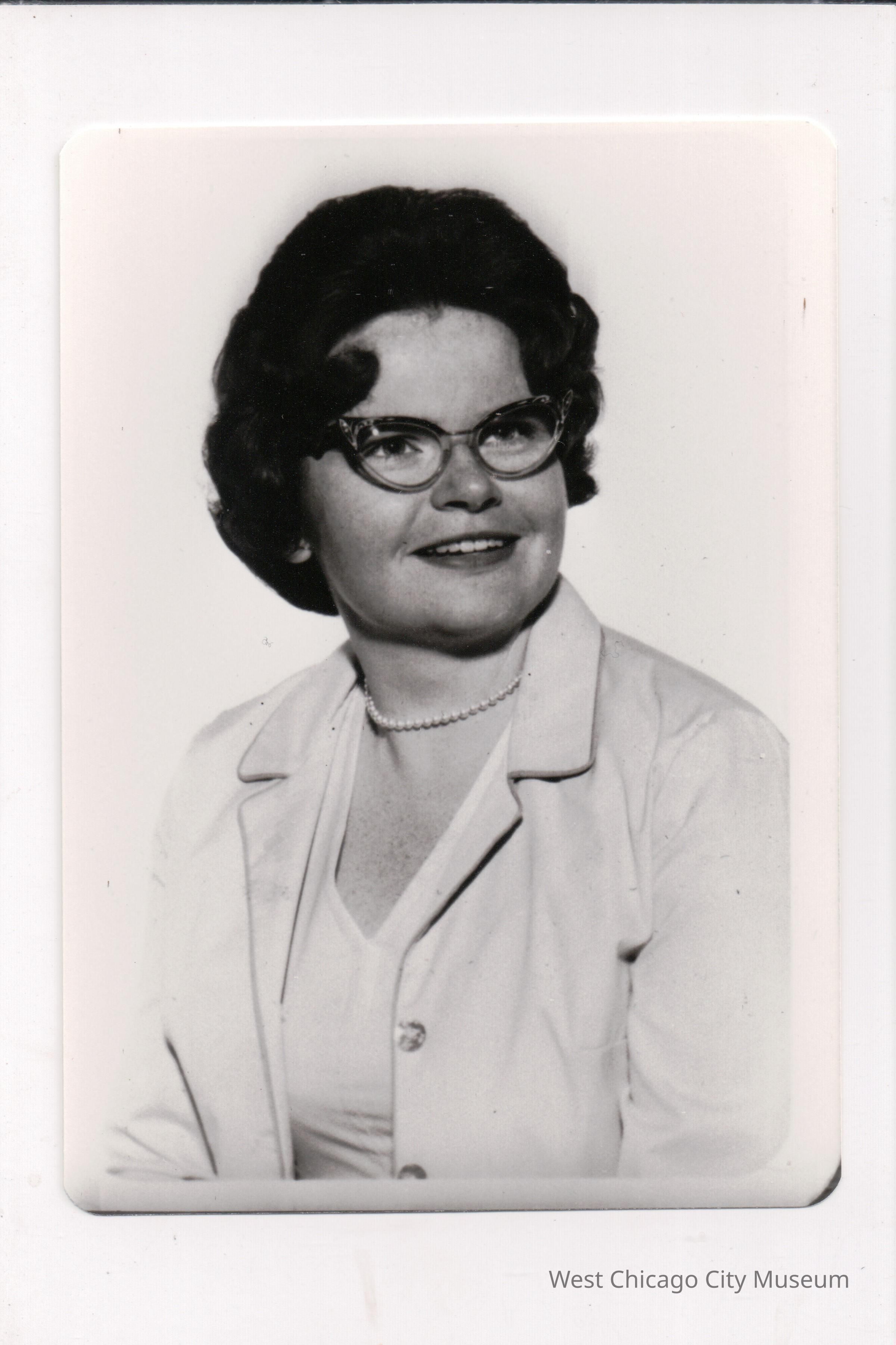 Photograph, black and white, of Margaret Buhr Kaelin. She is posed smiling, looking to the right of the camera. Shw has curled and set dark hair, plastic framed cat eye glasses, pearl choker and is weraing a light jacket over a v neck shirt.