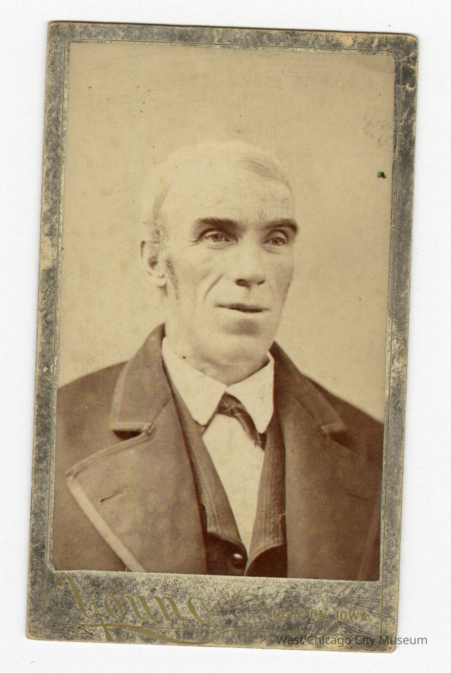 Photograph; Looks like tintype, ferrotype, or melainotype. Man in collared shirt and coat slightly angled to the right, not looking directly in the camera, mouth slightly agape, has sideburns, eyebrows are darker than hair, and hair is very light and combed to the right. Along bottom edge golden writing that looks like “Young” on left and “Iowa” on right.Photograph Details