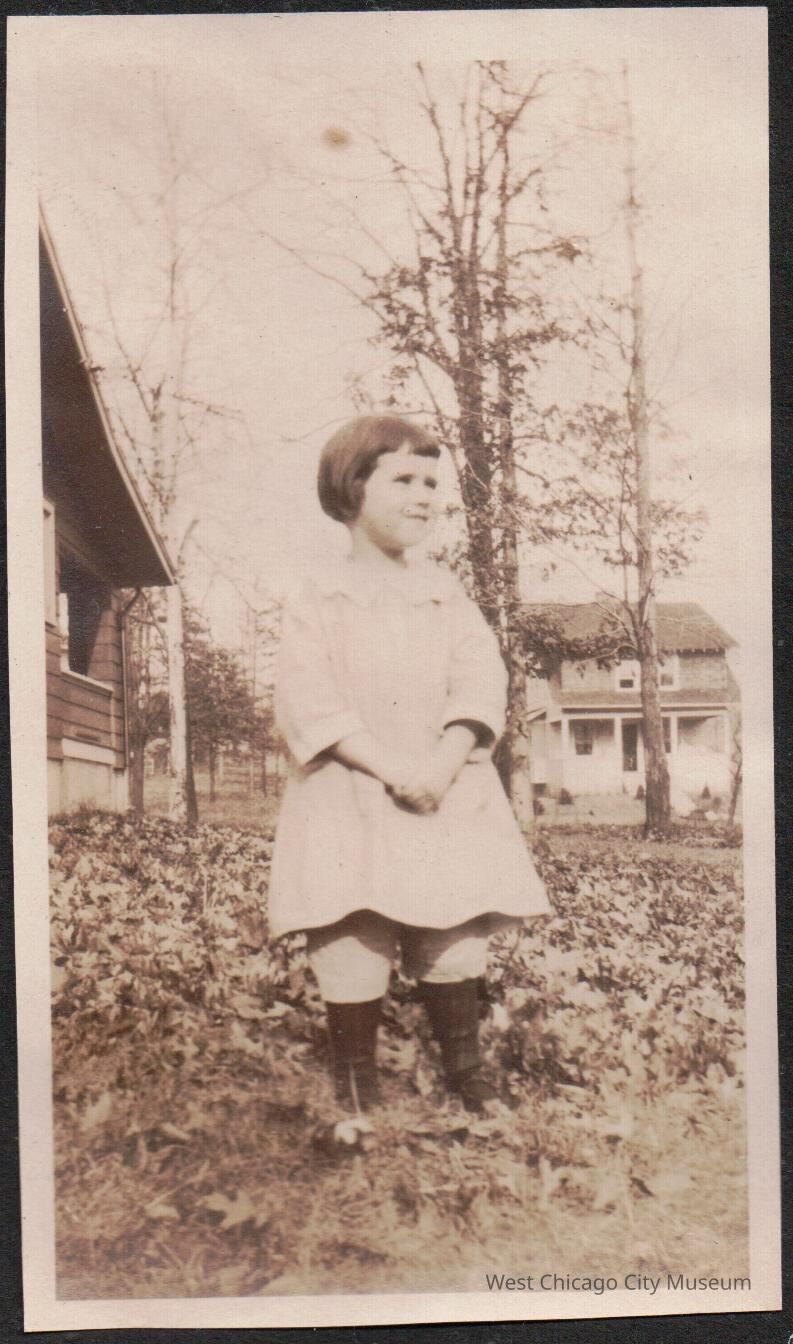 Arleen Alexander standing in yard among fallen leaves Dec 1924