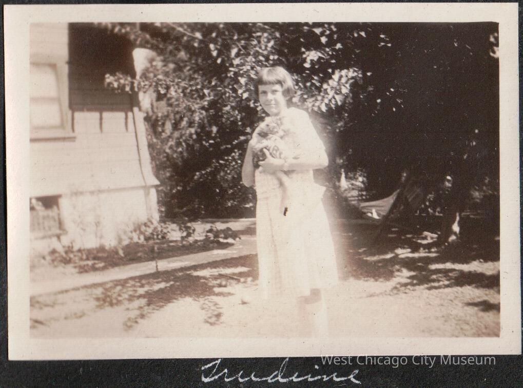 Photograph, showing Trudeine Brabrook standing in yard with cat in arms. It's a shady lawn, and the is the corner of a home in the left side of the photo. She has bobbed hair and is wearing a white drop waist dress. The photo is pasted on black paper and was part of the Alexander family album.