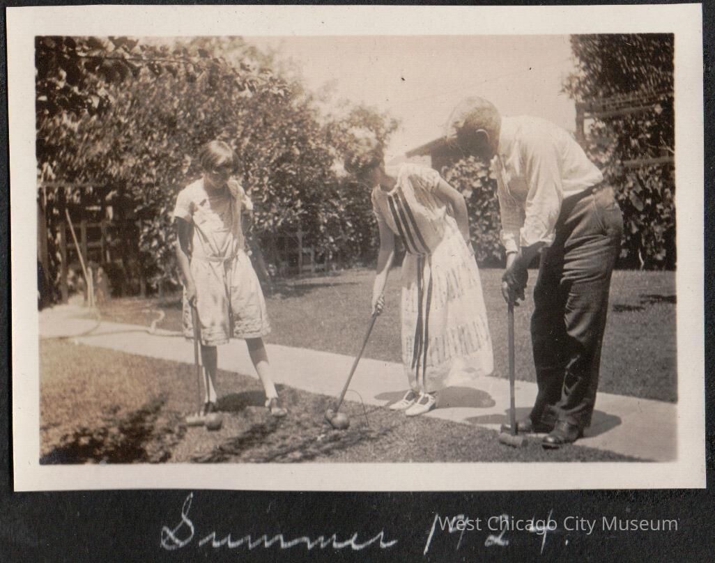 Photograph, black and white, showing two girls and man playing croquet on lawn Summer 1924. The younger girl, possibly Trudeine Brabrook, is wearing a split skirt. The older girl, possibly Frances Brabrook, has a white dress with ribbon accents and three long ribbons down the front. The photo is pasted on black paper and was part of the Alexander family albumPhotograph Details