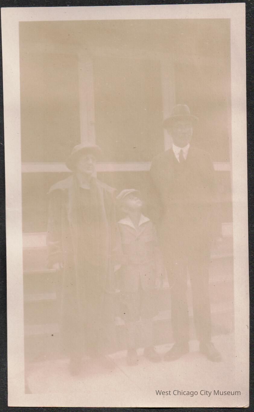 Photograph, black and white, shows a man, woman, and boy probably John Thogerson standing in front of house porch Sept 1924. The boy is looking up to man. The adults may be his parents.