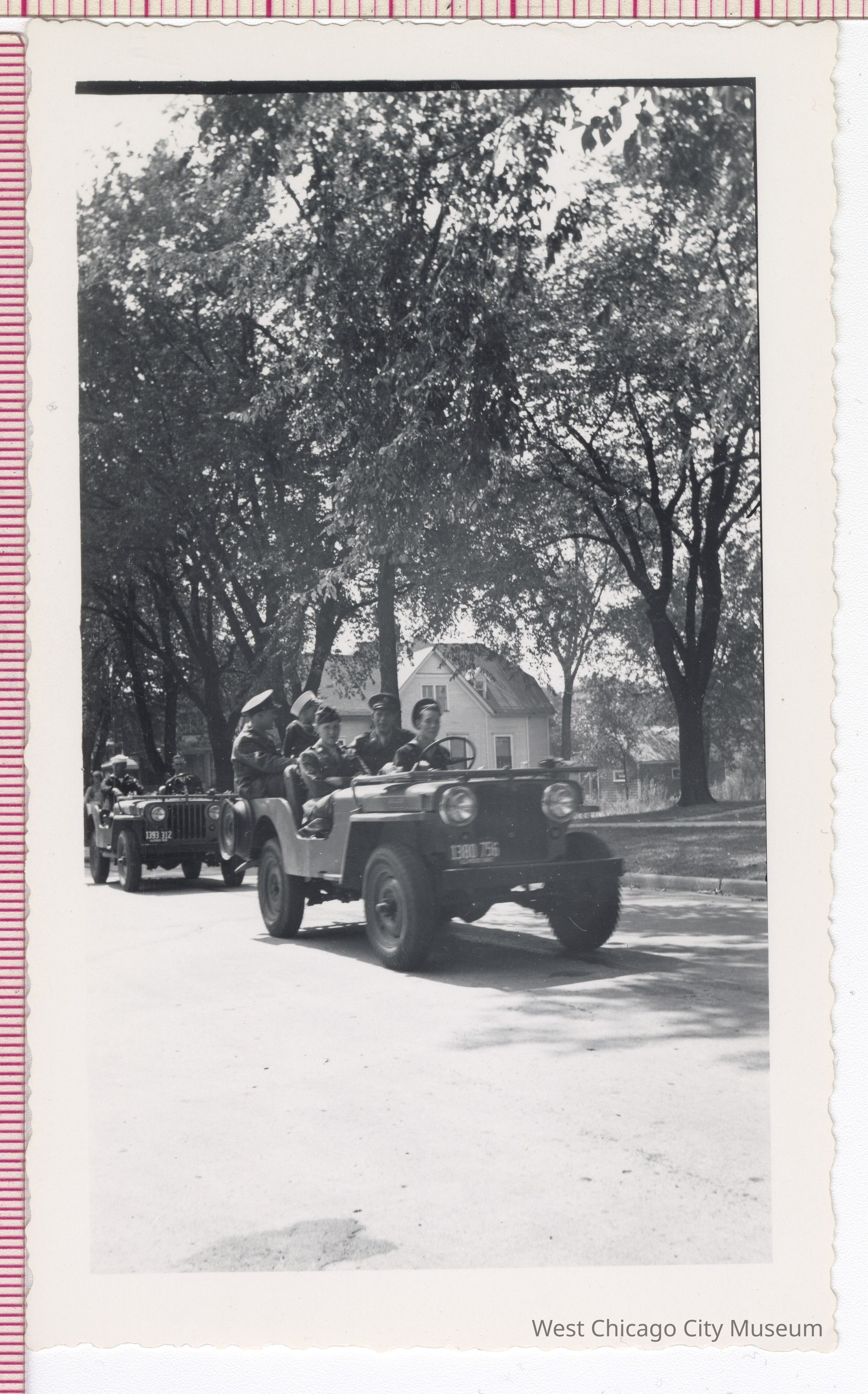 Photograph, b/w, soldiers driving hum-vees (2 pictured) in parade (in West Chicago?), houses in background, 5.5 x 3.25” white border with wavy edge, “766H”? stamped in black on reversePhotograph Details