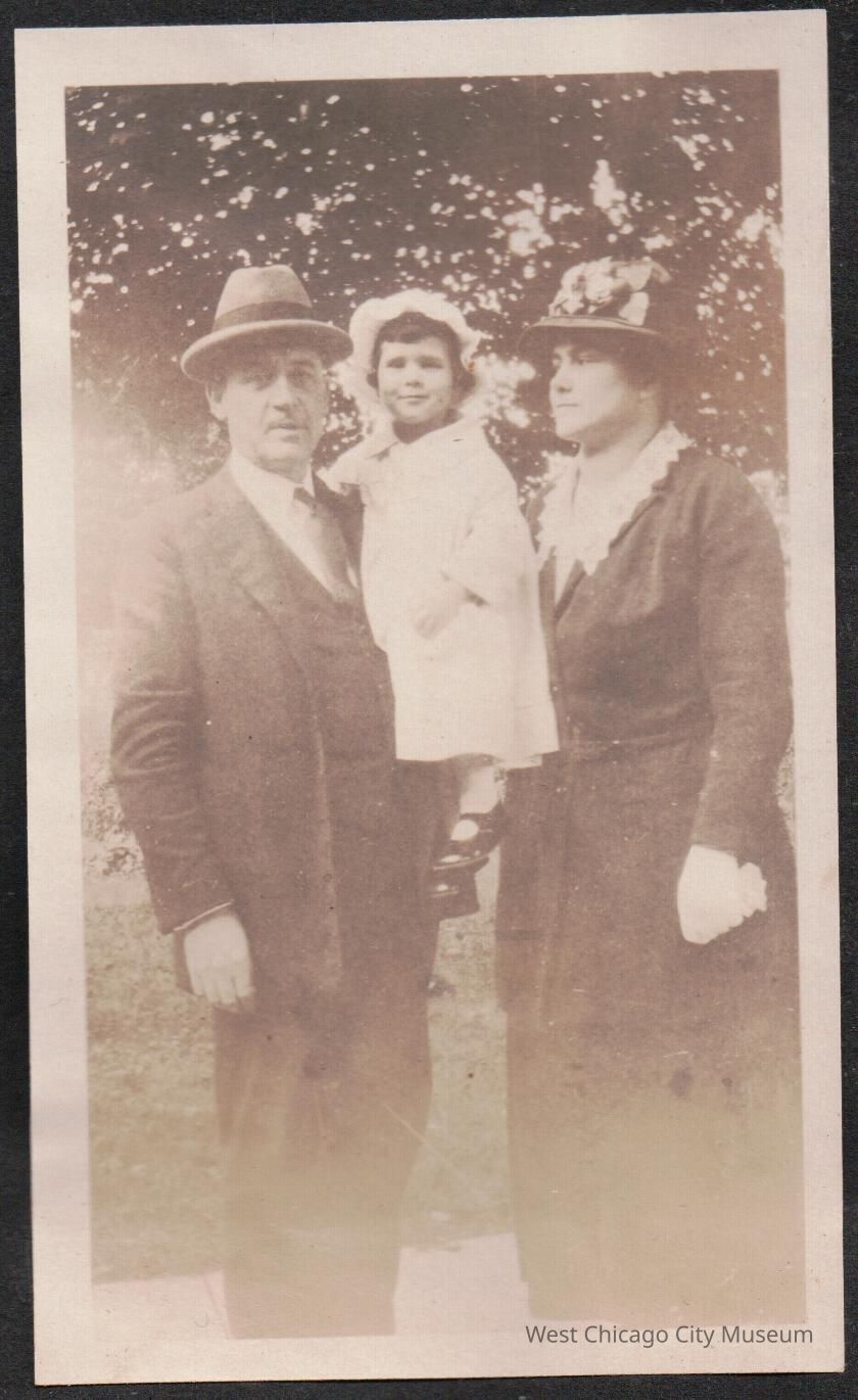 Photograph, black and white, showing a Man and woman standing outside, man holding small girl in a white dress and ruffled cap. Photo is likely Arleen Alexander and her parents Bertha and Harrison Kern Alexander, Sept 1924