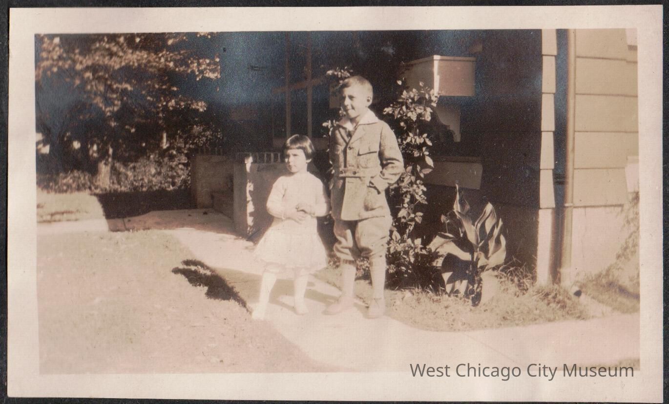 Two children, probably John Thogerson and Arleen Alexander, standing on path at corner of house Sept 1924