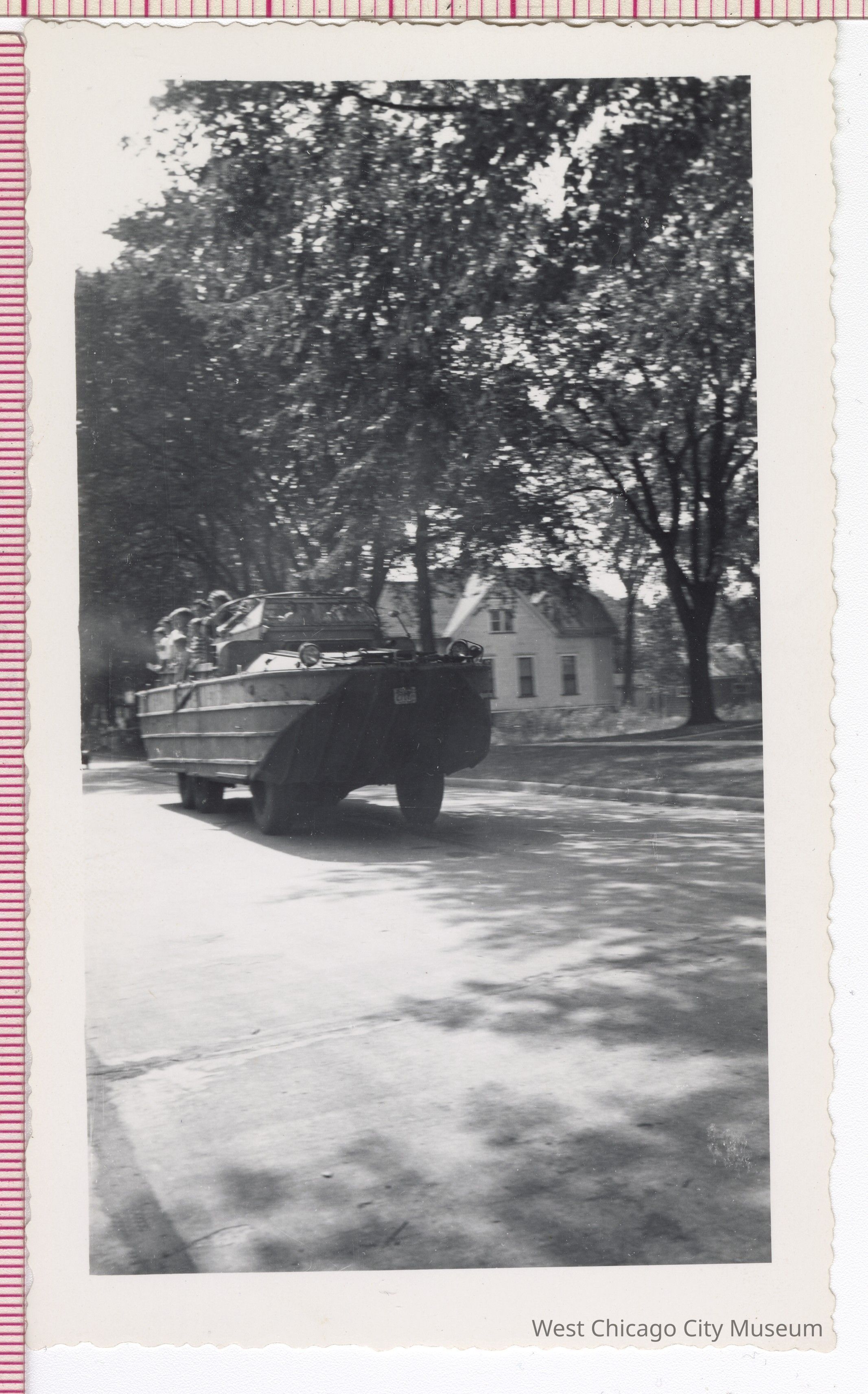 Photograph, b/w, soldiers driving floatila in parade (in West Chicago?), houses in background, 5.5 x 3.25” white border with wavy edge, “766H”? stamped in black on reversePhotograph Details