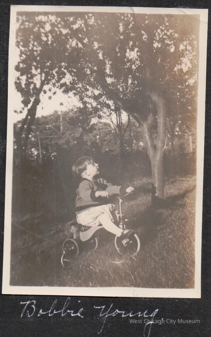 Photograph, black and white, showing Bobbie Young as a young child on tricycle. They are outside, and they are wearing a sweater. The image is pasted to a black sheet of paper and was part to the Alexander family photo album.