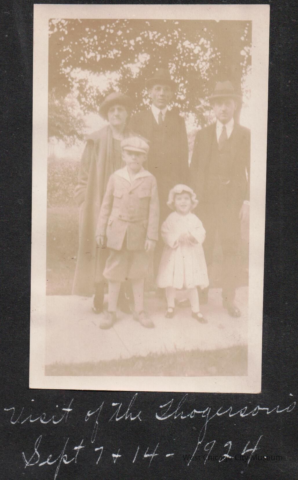 Photograph, black and white, showing a group - a woman, two men, a boy (about age 6, likely John Thogerson) and a small girl (likely Arleen Alexander). They are standing on a sidewalk, and there is a large tree behind them. The photo was taken during Thogerson's visit Sept 1924. The adults behind John Thogerson are possibly his parents, and the man on the right behind the girl might be her father Harrison AlexanderPhotograph Details