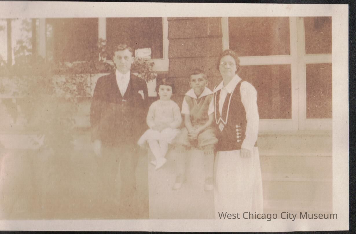 Man and woman standing on each side of a cement stair wall on a set of porch stairs, with a boy (roughly age 5, likely John Thogerson) and Arleen Alexander (2-3 years old) seated on the wall. The man is in a dark 3 piece suit, the woman is in white with a dark, drop waist style vest. Dated Sept 1924. The man is likely Arleen's father Kern, and the woman is possibly his sister, John's mother, Klea Alexander ThogersonPhotograph Details
