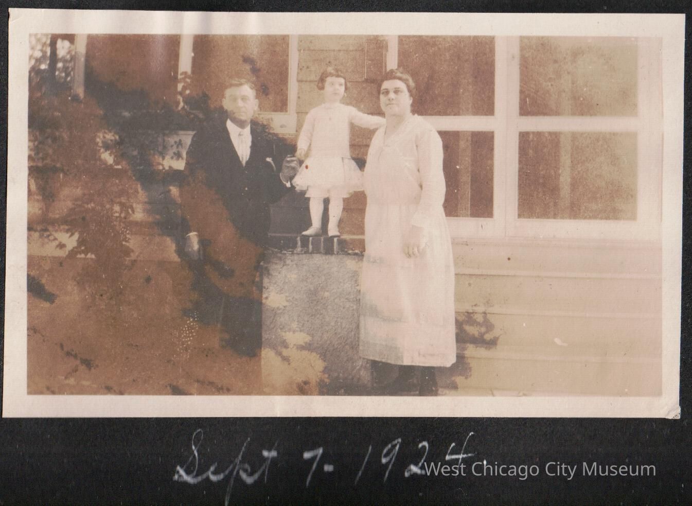 Photograph, Man and woman standing on each side of a child, likely Arleen Alexander who is standing on a brick topped cement porch stair rail. Photograph is a snapshot, black and white, and attached to a black scrapbook page with "Sept 7, 1924" written below. Arleen is in a short dress with long sleeves. The woman is also in white, and the man is in a black suit. The home has siding, and large screens on the porch. The adults are likely her parents, Harrison Kern Alexander and Bertha AlexanderPhotograph Details