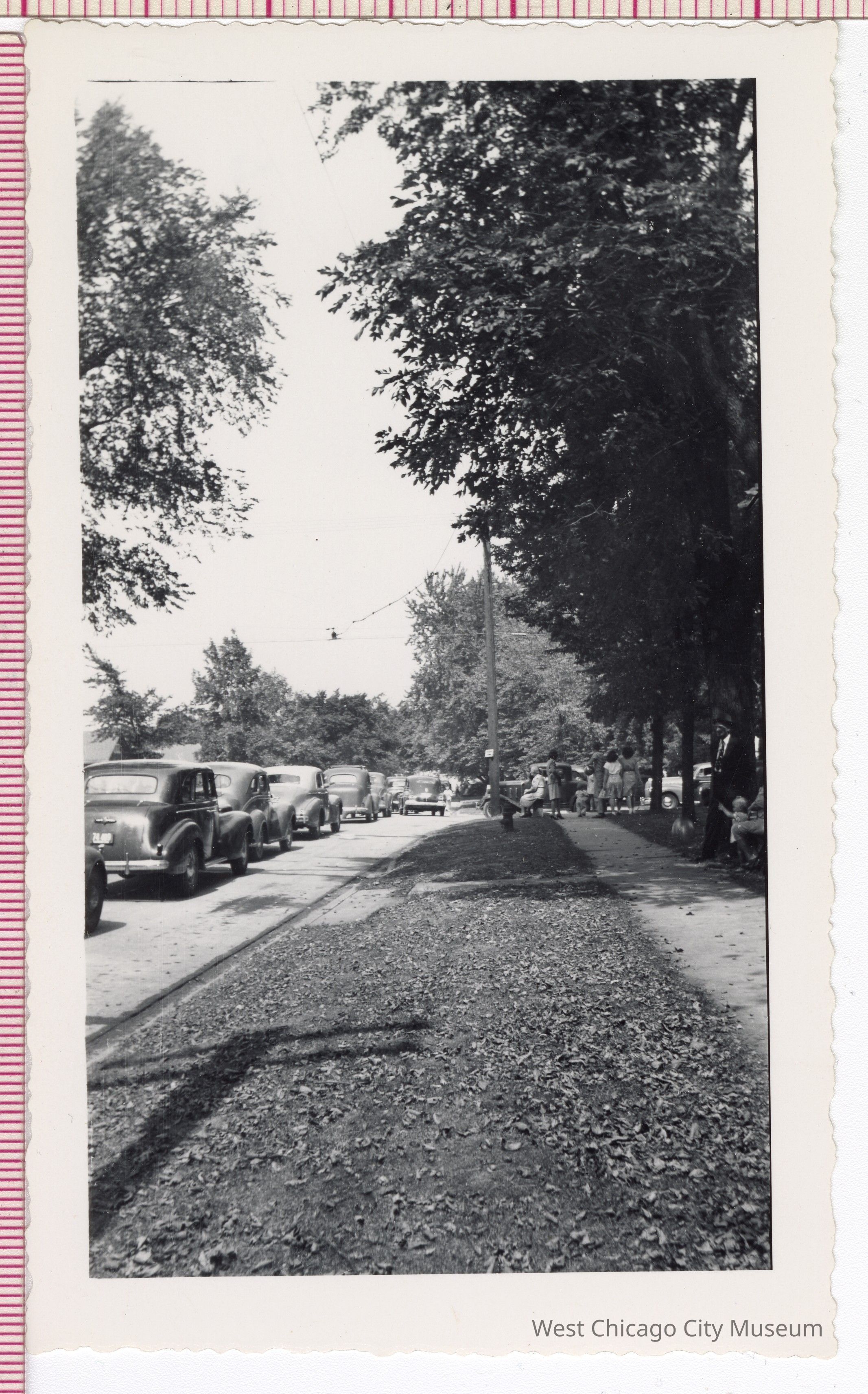 Photograph, b/w, cars lined up and driving? in parade (in West Chicago?), parkway also pictured and spectators along the sidewalk, 5.5 x 3.25” white border with wavy edge, “766H”? stamped in black on reversePhotograph Details