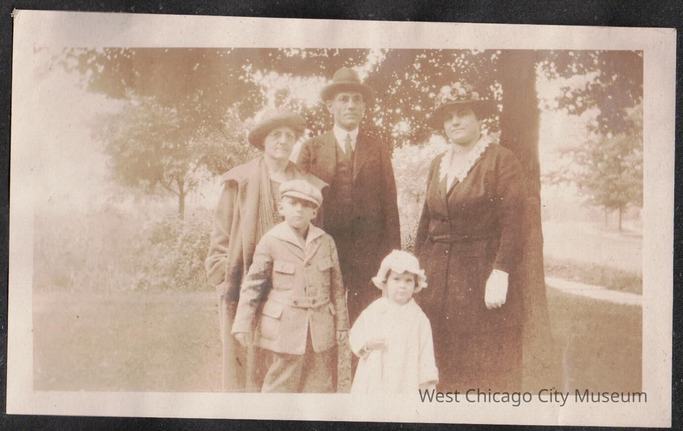 Two women, man, boy, and girl standing in front of tree during Thogerson's visit Sept 1924. The trees are in full leaf, but the group is wearing jackets and hats. The two children are roughly 6 (boy, possibly John Thogerson) and 3 (girl, possibly Arleen Alexander). Behind the girl on the right is possibly her mother Bertha.Photograph Details