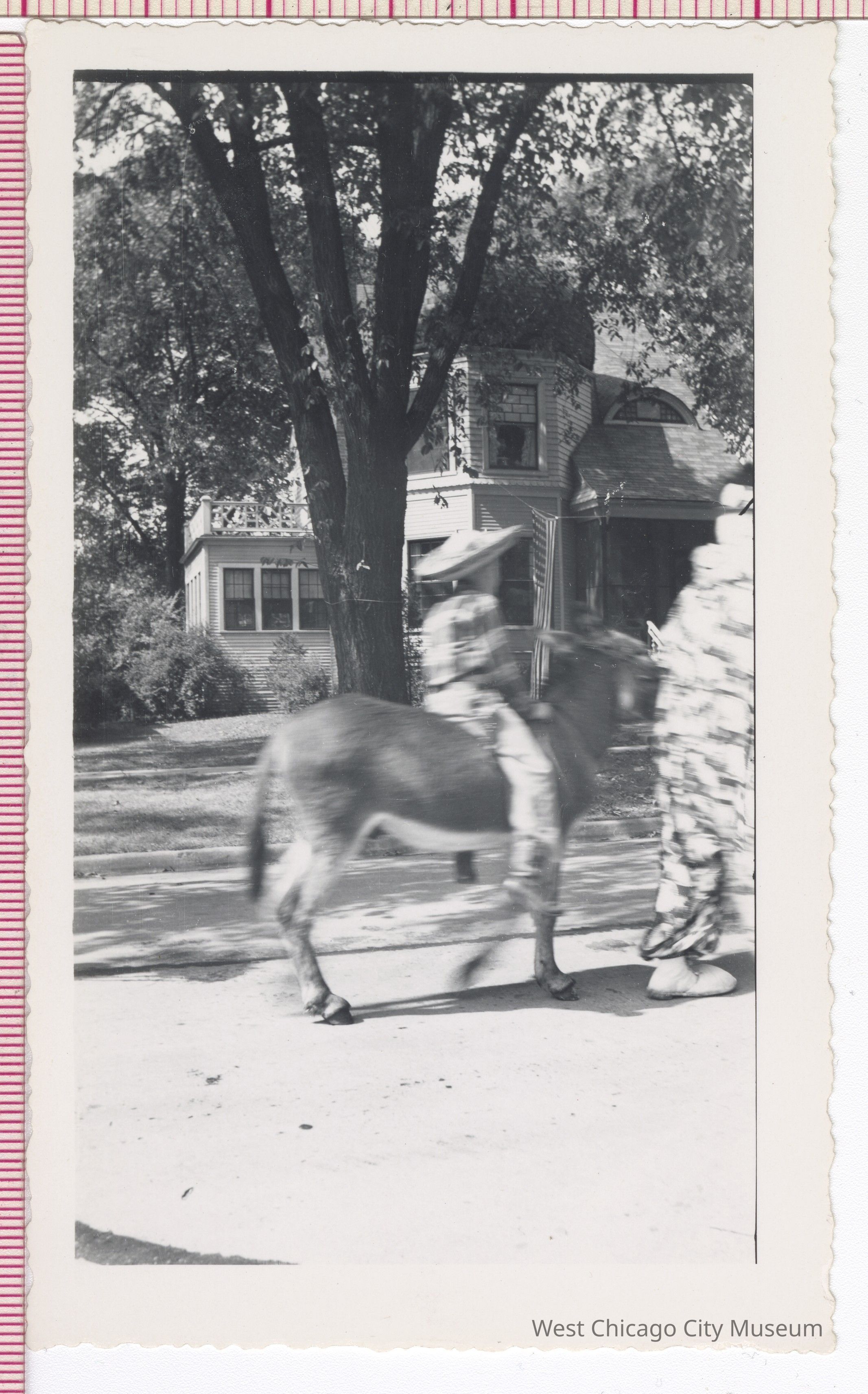 Photograph, b/w, person on a donkey in parade and portion of a walker (in West Chicago?), house in background, 5.5 x 3.25” white border with wavy edge, “766H”? stamped in black on reversePhotograph Details
