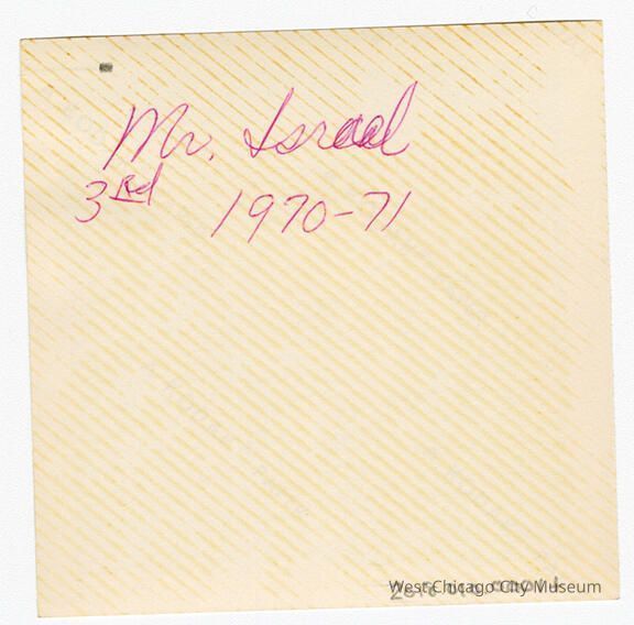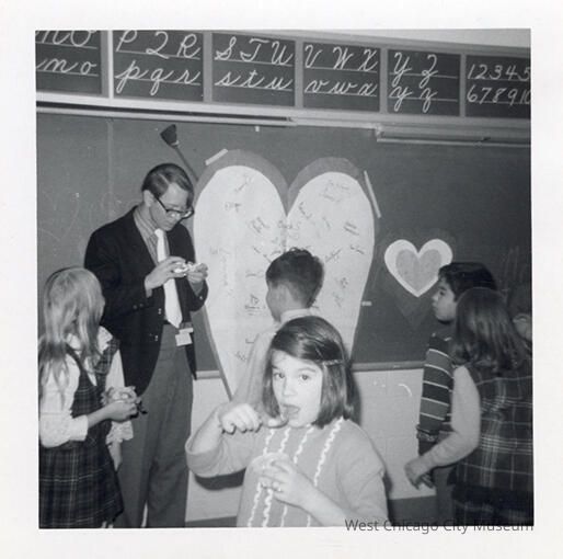 Indian Knoll School photos, black and white, square - Shows Mr. Israel and students eating treats with a spoon. There is a large heart on the blackboard. Back reads "Mr. Israel 3rd 1970-71"